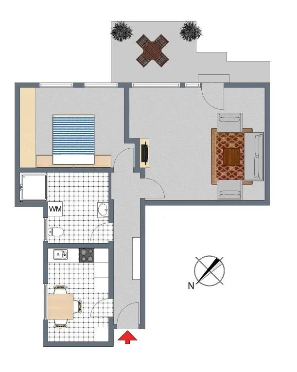Das Wohnzimmer und das Schlafzimmer sind nach Südosten ausgerichtet. Das Badezimmer und die Küche sind nach Nordosten ausgerichtet.