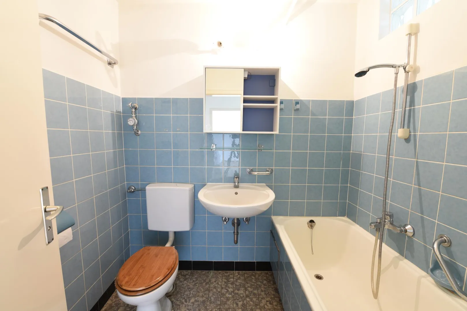 Das halbhoch geflieste Badezimmer aus dem Ursprungsbaujahr ist ausgestattet mit einem Fliesenboden, einer Badewanne sowie einem WC.