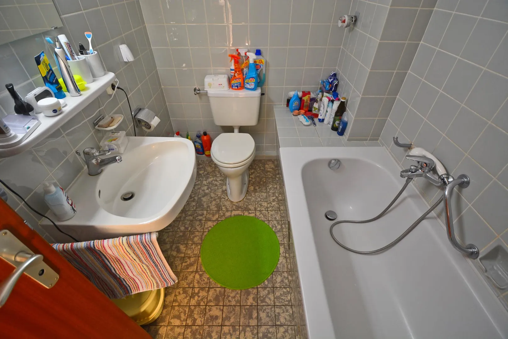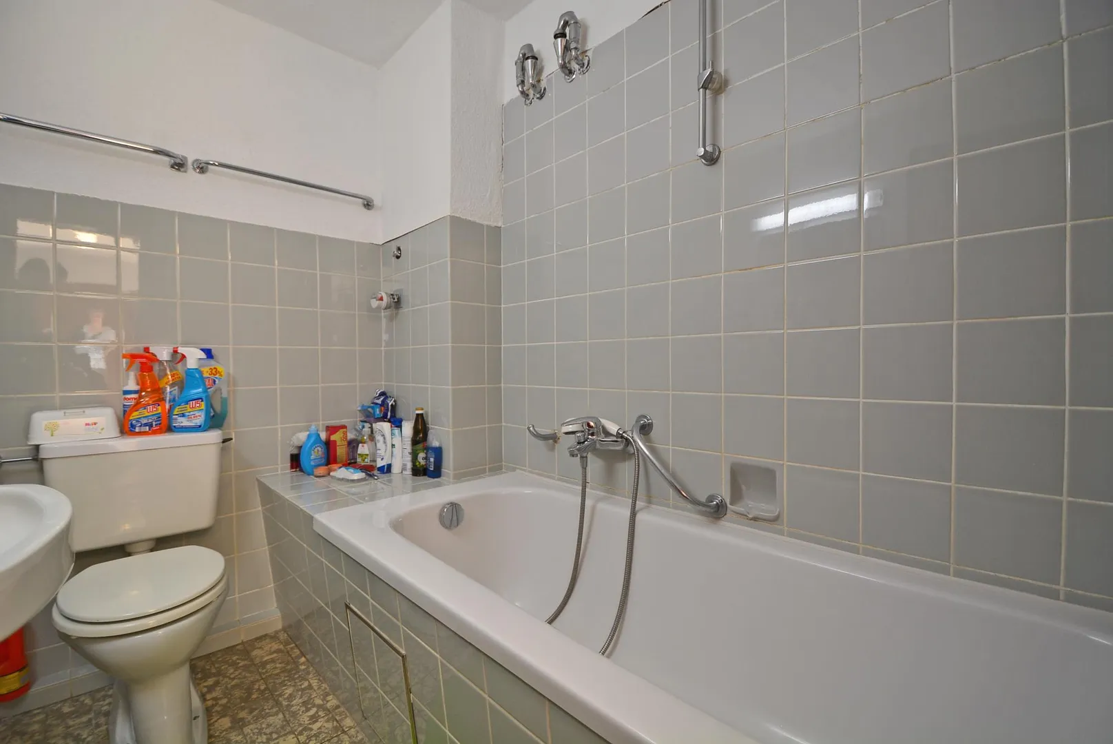 Das halbhoch geflieste Badezimmer ist ausgestattet mit einem Fliesenboden, einer Badewanne sowie einem WC.