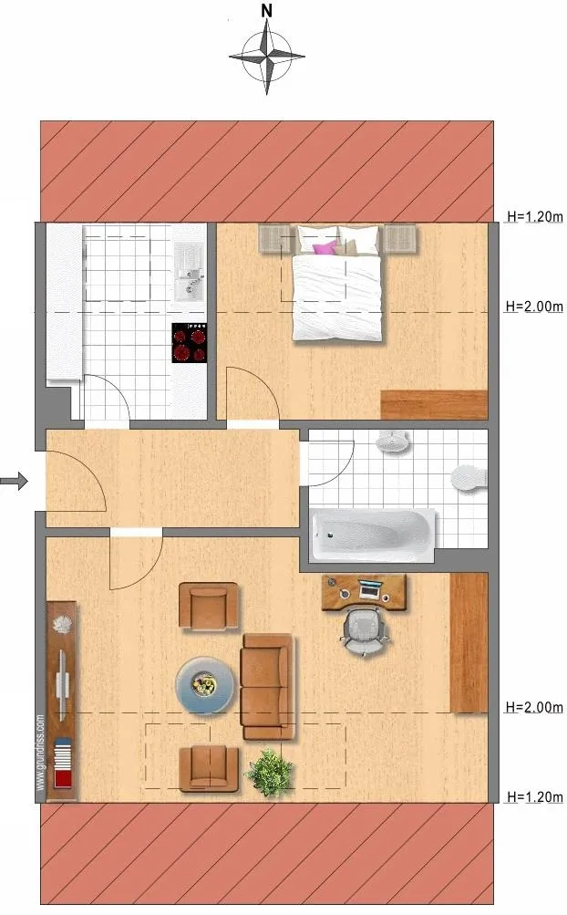 Das Wohnzimmer ist nach Süden ausgerichtet. Die Küche und das Schlafzimmer sind nach Norden ausgerichtet.