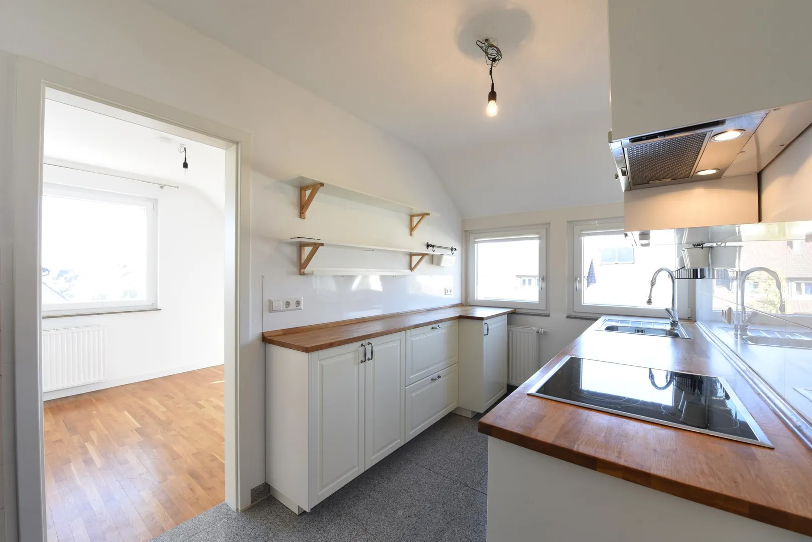 Die Wände sind mit Raufasertapeten tapeziert und weiß gestrichen.