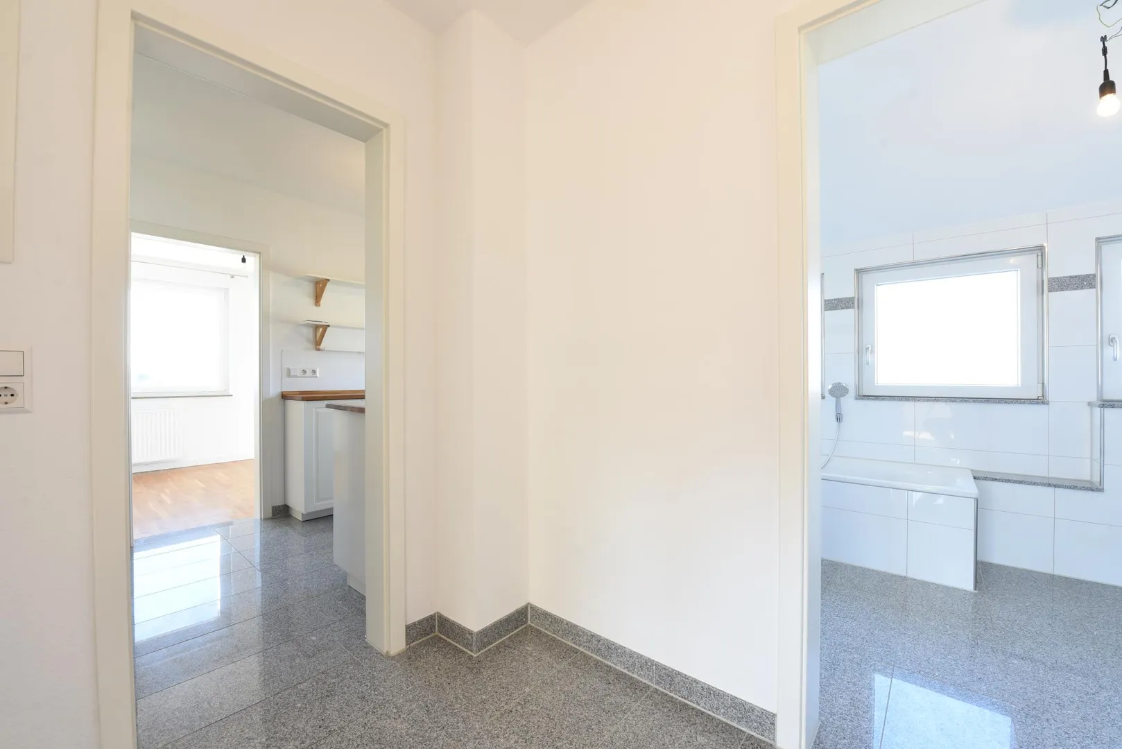 In den Zimmern ist Parkettboden verlegt. Der Boden im Flur, in der Küche und im Badezimmer ist mit Granit-Fliesen ausgestattet.