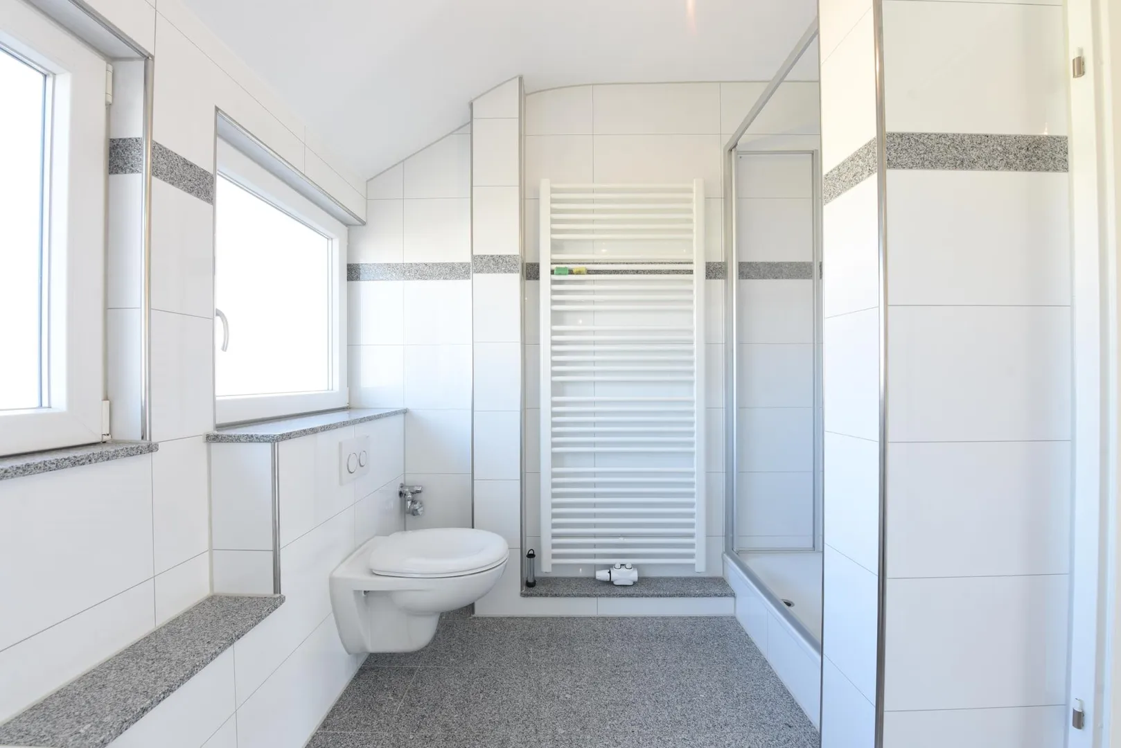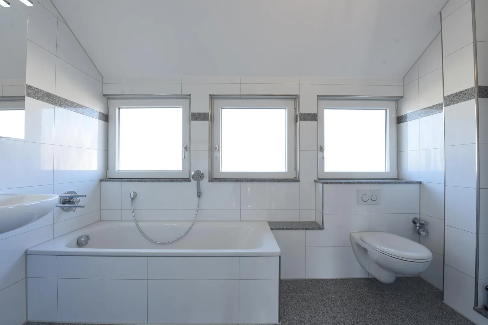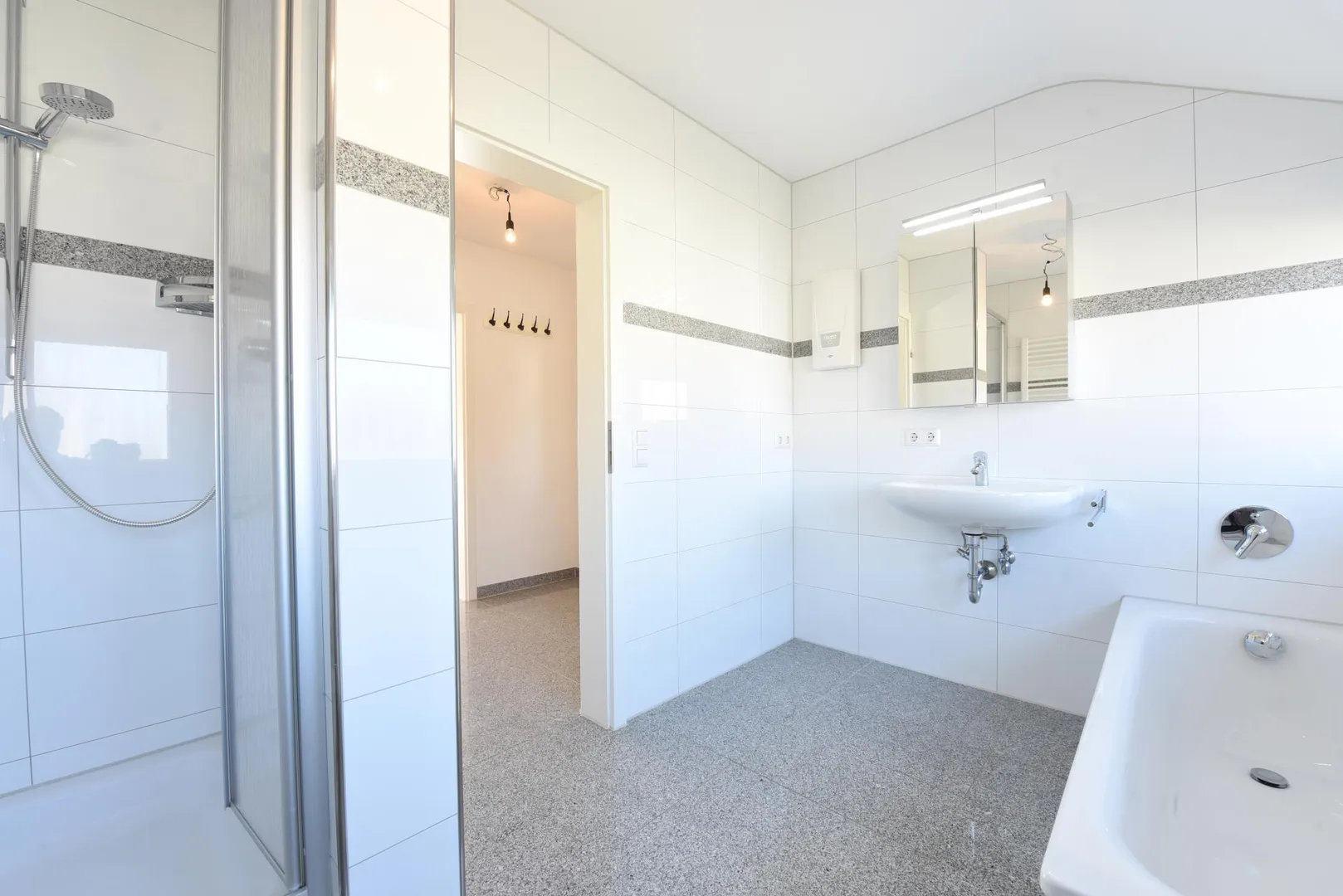 Das raumhoch geflieste Badezimmer mit Fenster verfügt über eine Badewanne, eine Dusche, ein WC, einen Handtuchheizkörper, einen Waschmaschinenanschluss sowie einen Spiegelschrank. Ein Waschtisch-Unterschrank sowie eine Waschmaschine können vom aktuellen Mieter übernommen werden.