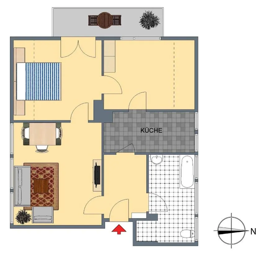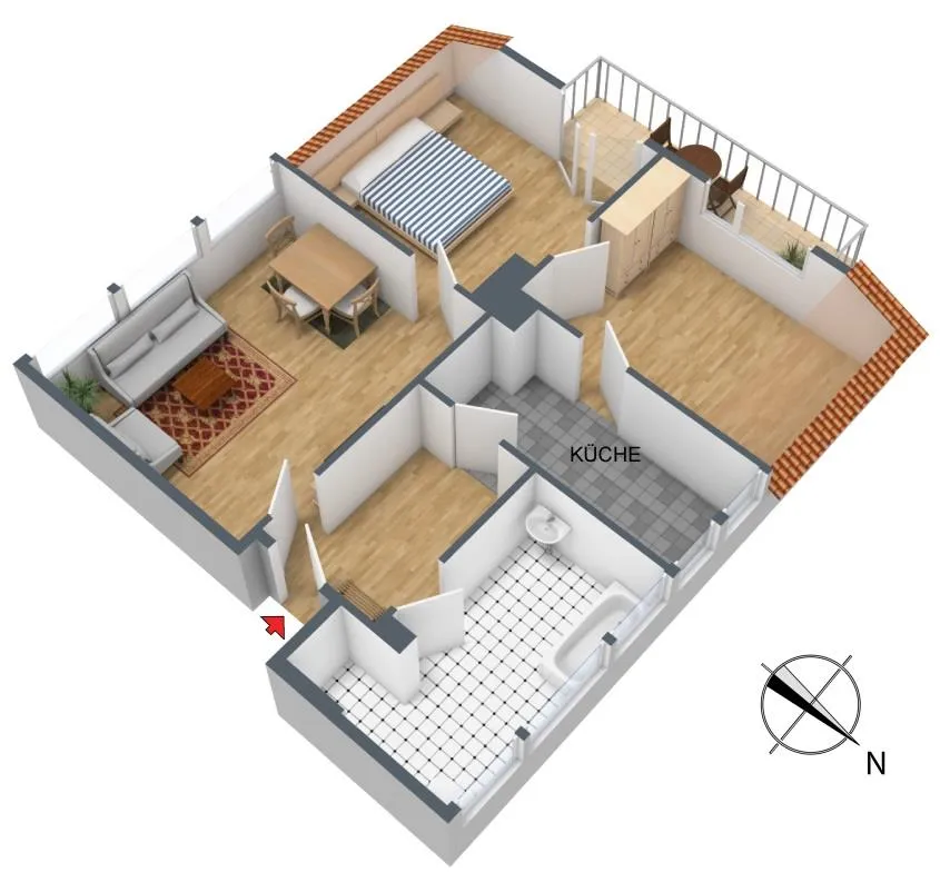 Vom Flur sind das Badezimmer, die Küche sowie das Wohnzimmer begehbar. Über das Wohnzimmer ist das Schlafzimmer begehbar, über die Küche ist das Arbeits-/Ankleidezimmer begehbar. Zwischen dem Arbeits-/Ankleidezimmer und dem Schlafzimmer befindet sich eine Durchgangstür.