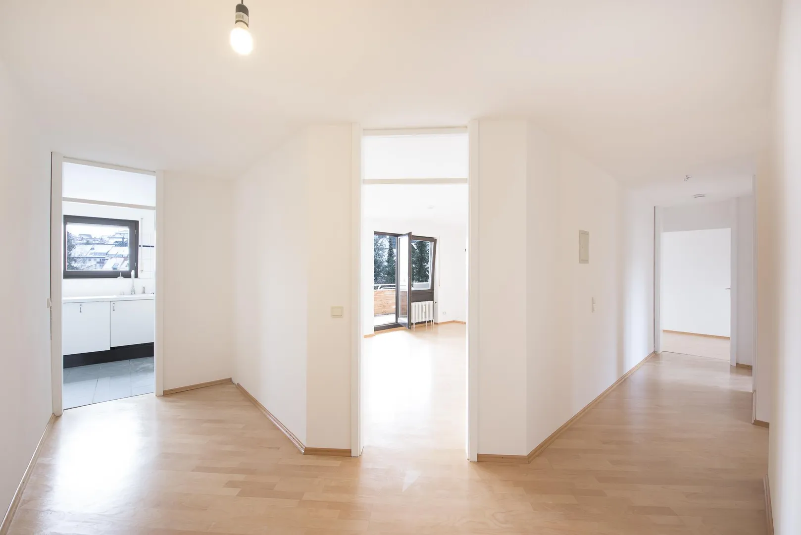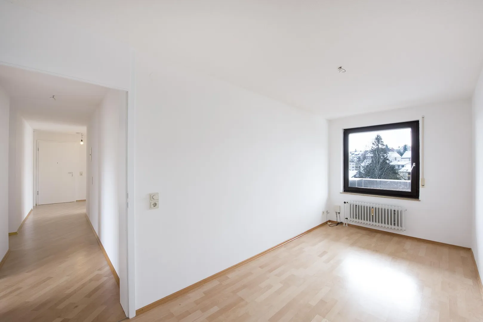 Die Böden im Flur und in den Zimmern sind mit Parkett ausgestattet. Der Parkett wurde frisch abgeschliffen und versiegelt.