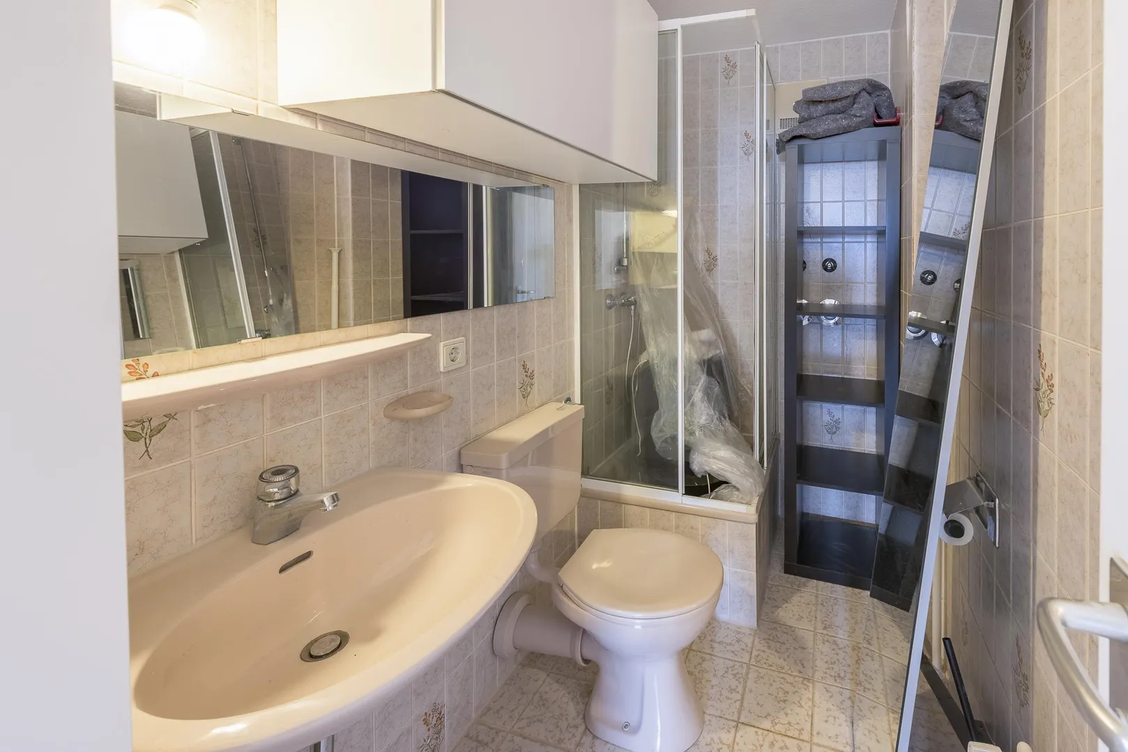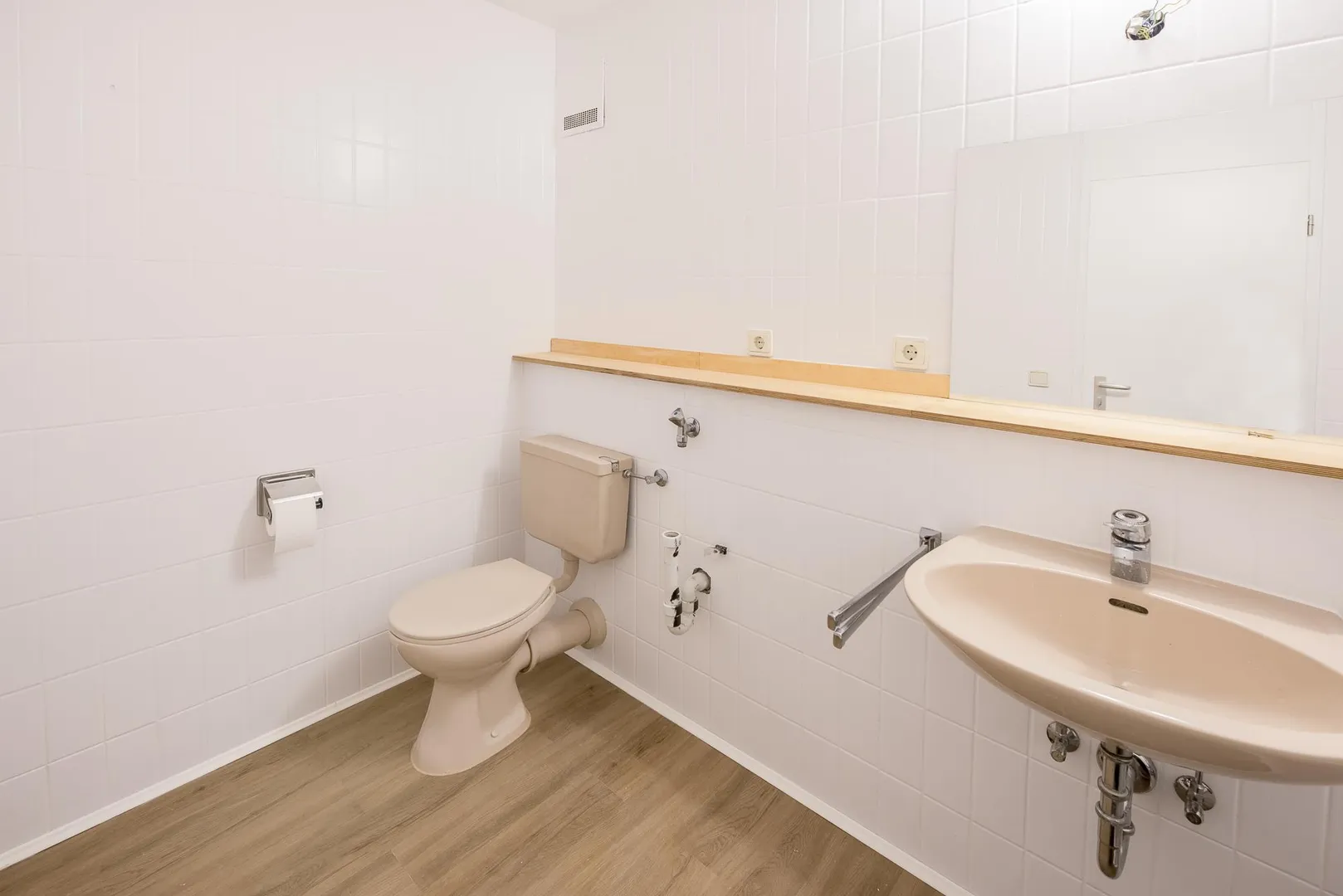 Die Böden in der Küche und im Bad mit Dusche sind gefliest. Der Boden im Bad mit Wanne ist mit Vinyl-Boden ausgestattet.