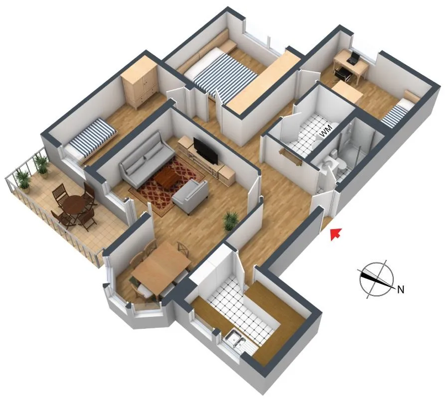 Die Küche, das Wohnzimmer sowie ein Kinderzimmer sind nach Süd-Osten ausgerichtet. Das Schlafzimmer und das zweite Kinderzimmer sind nach Nord-Westen ausgerichtet.