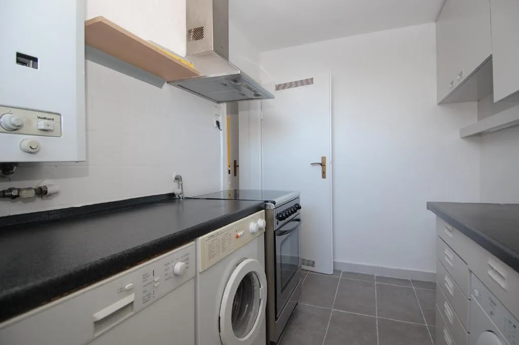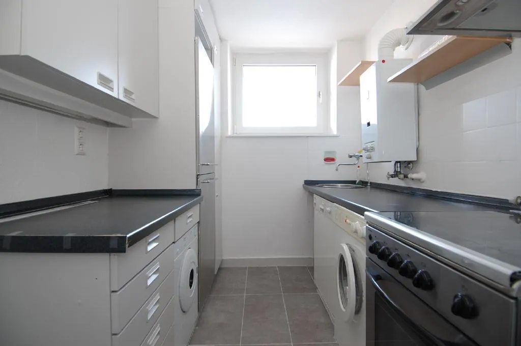 Die Küche ist mit einer Einbauküche mit einem Kühlschrank, einem Gefrierschrank, einer Spülmaschine, einem Gasherd mit Backofen, einem Trockner, einer Waschmaschine sowie Unter- und Oberschränken ausgestattet.