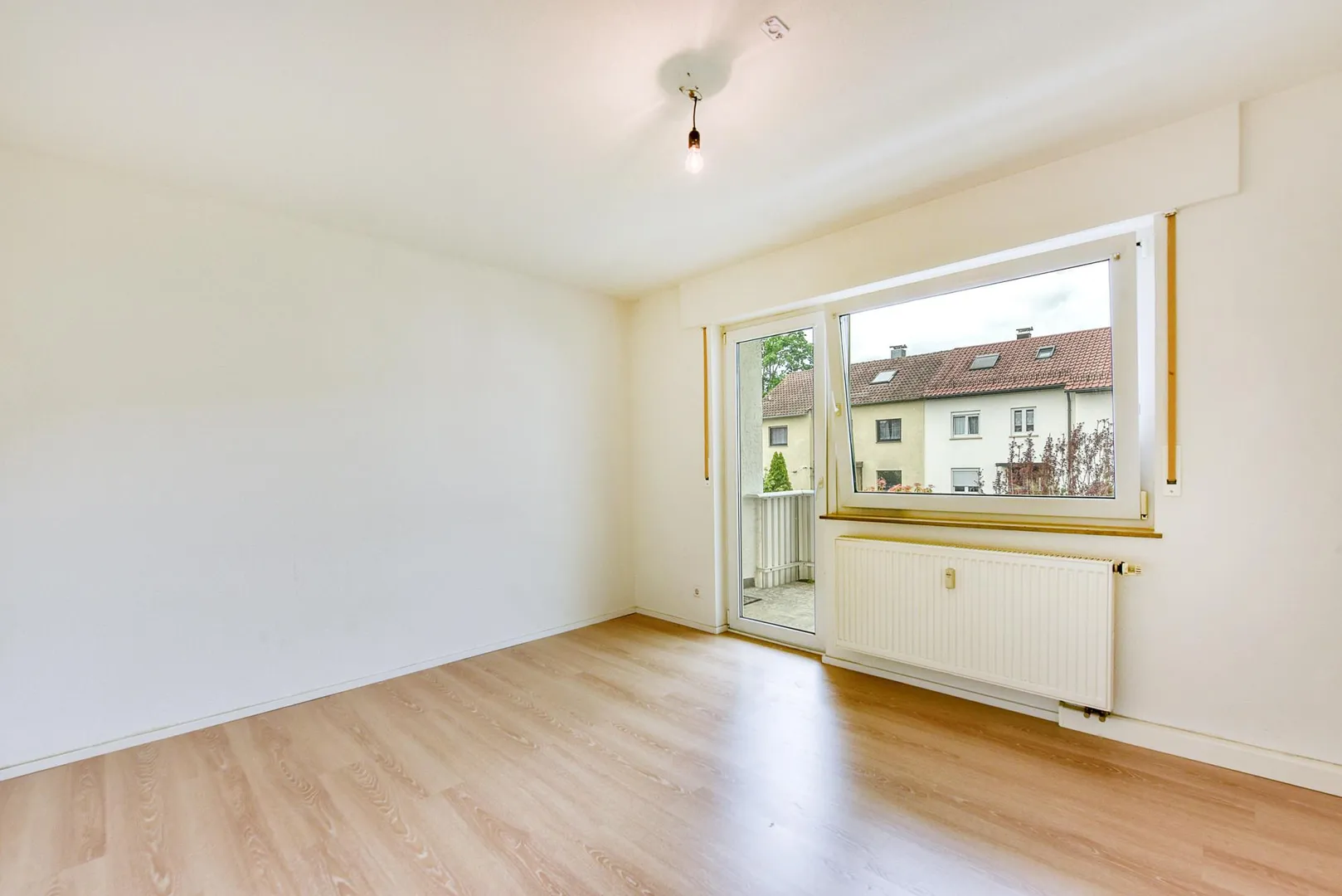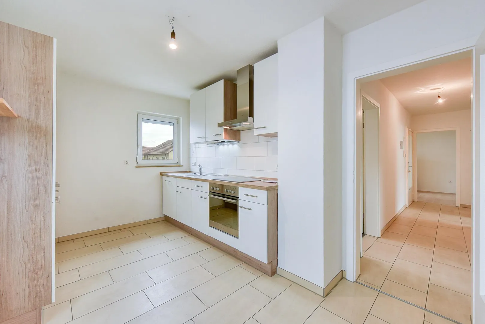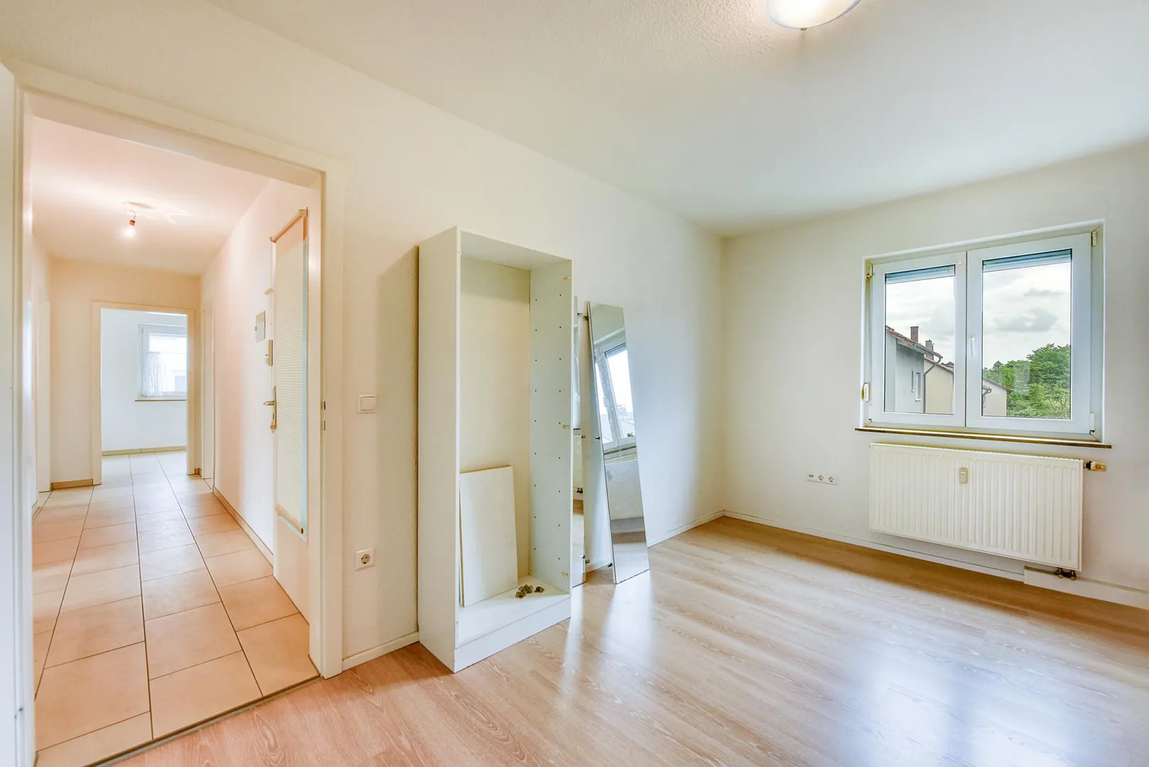In den Zimmern sind Laminatböden verlegt. Die Böden in der Küche, im Flur sowie im Badezimmer sind gefliest.
