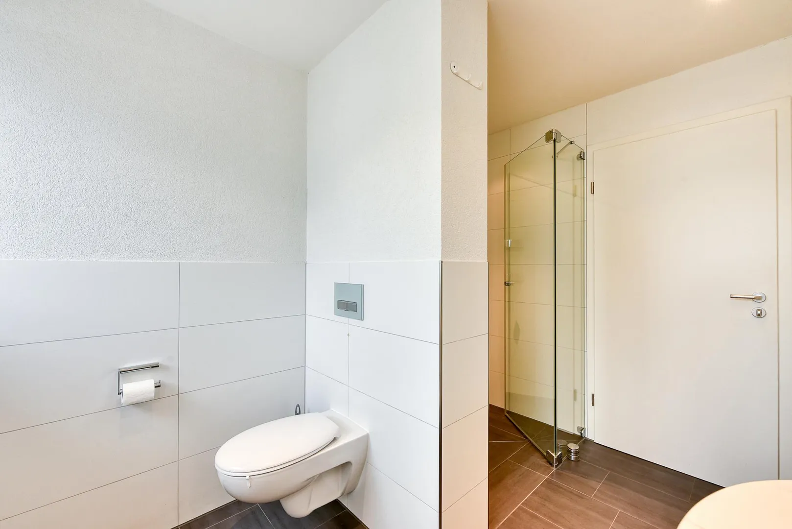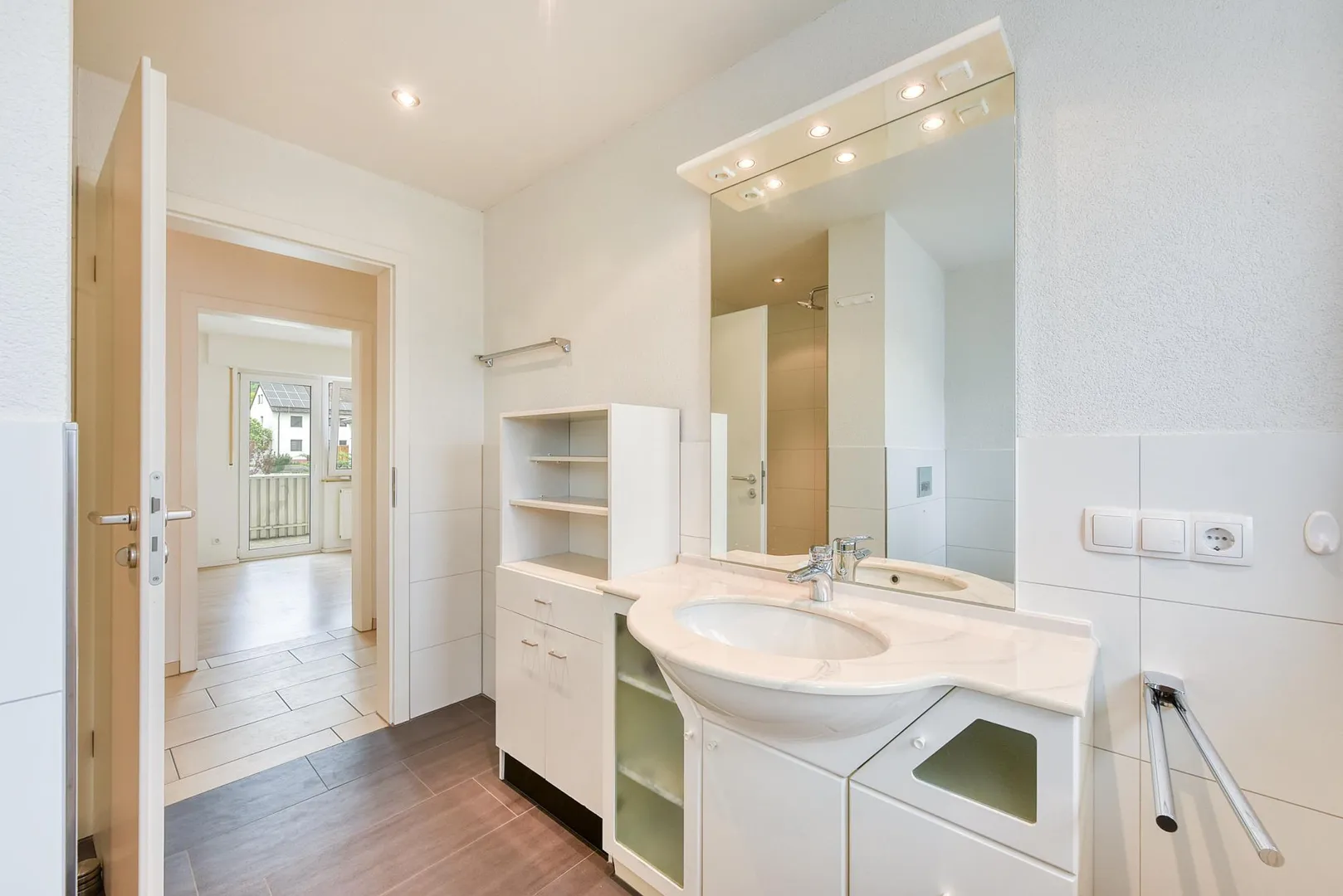 Das Tageslicht-Bad wurde 2014 modernisiert und ist ausgestattet mit einem Fliesenboden, einer bodentiefen Dusche, einem WC, einer abgehängten Decke mit Halogenlichtern, einem Spiegel mit Belichtung, einem Waschtisch-Unterschrank sowie einem Schränkle.