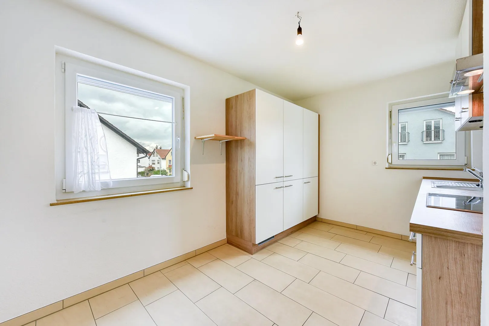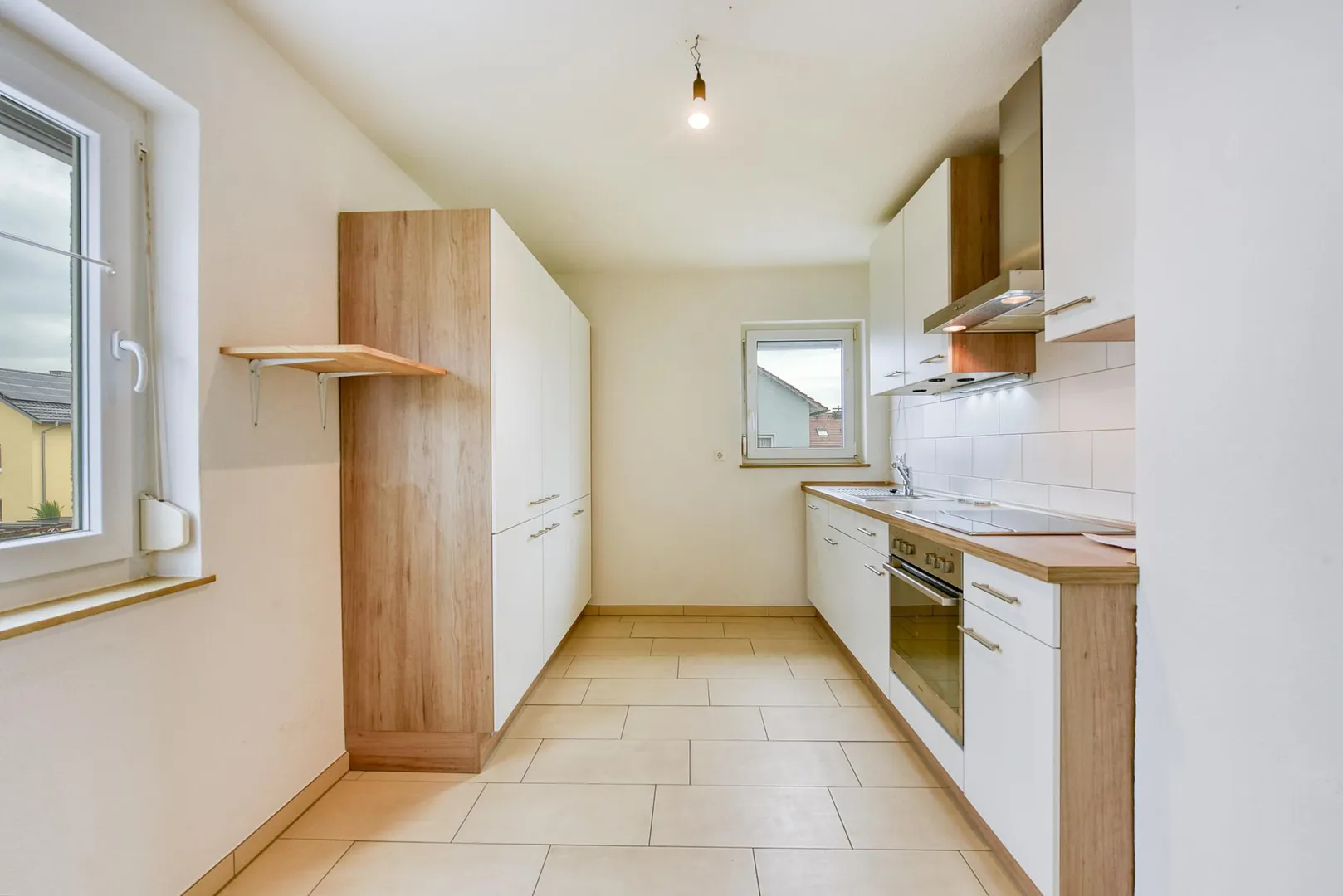 Die Einbauküche ist von 2014 und verfügt alle notwendigen Elektro-Geräte. Die E-Geräte sind funktionsfähig. Eine Haftung für die künftige Funktionsfähigkeit der Elektro-Geräte wird vom Vermieter nicht übernommen.