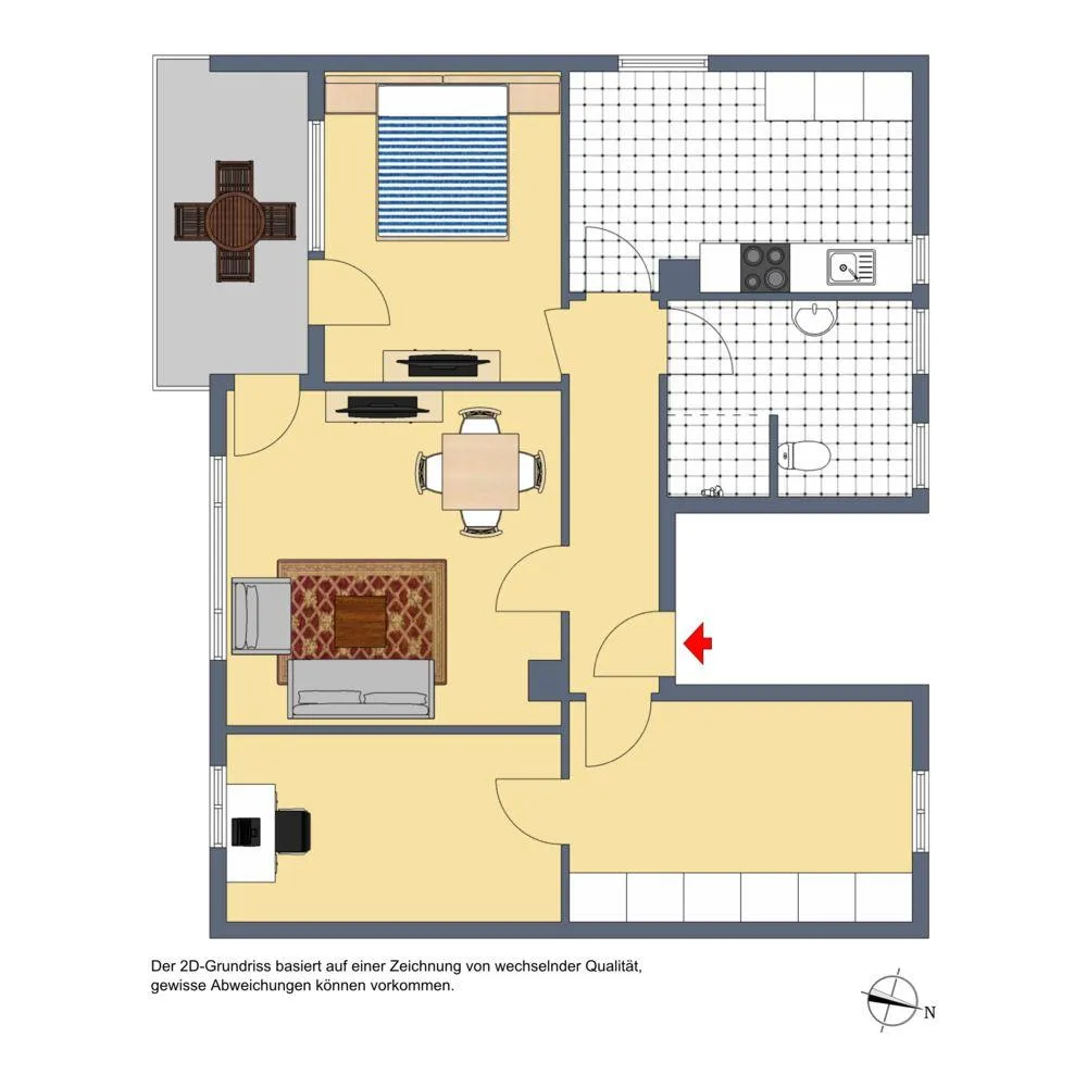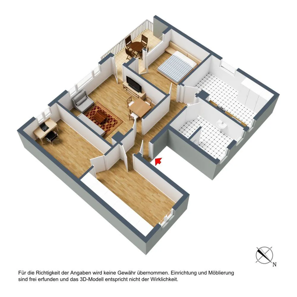 Der Grundriss der Wohnung ist gut. Bis auf das Arbeitszimmer sind alle Räume vom Flur begehbar. Das Arbeitszimmer ist über das Ankleidezimmer begehbar (gefangenes Zimmer). Das Badezimmer mit WC verfügt über zwei Fenster. Der ca. 6,7 m² große und überdachte Süd-Balkon ist sowohl über das Wohnzimmer, als auch über das Schlafzimmer begehbar.