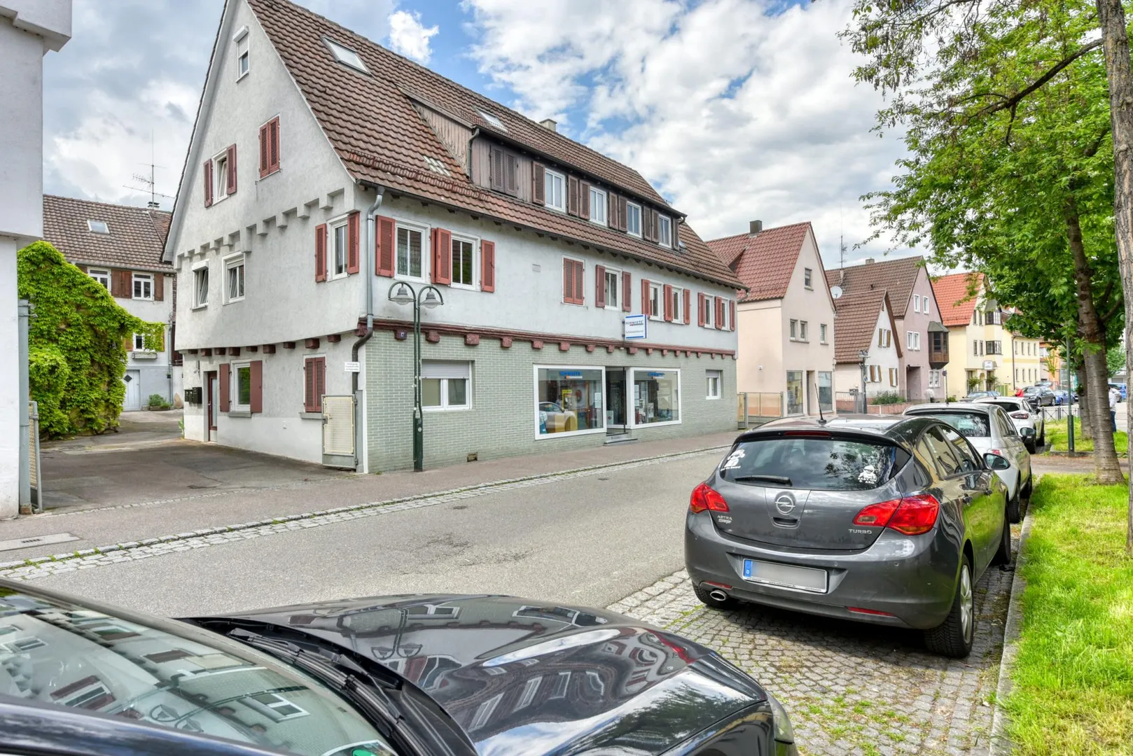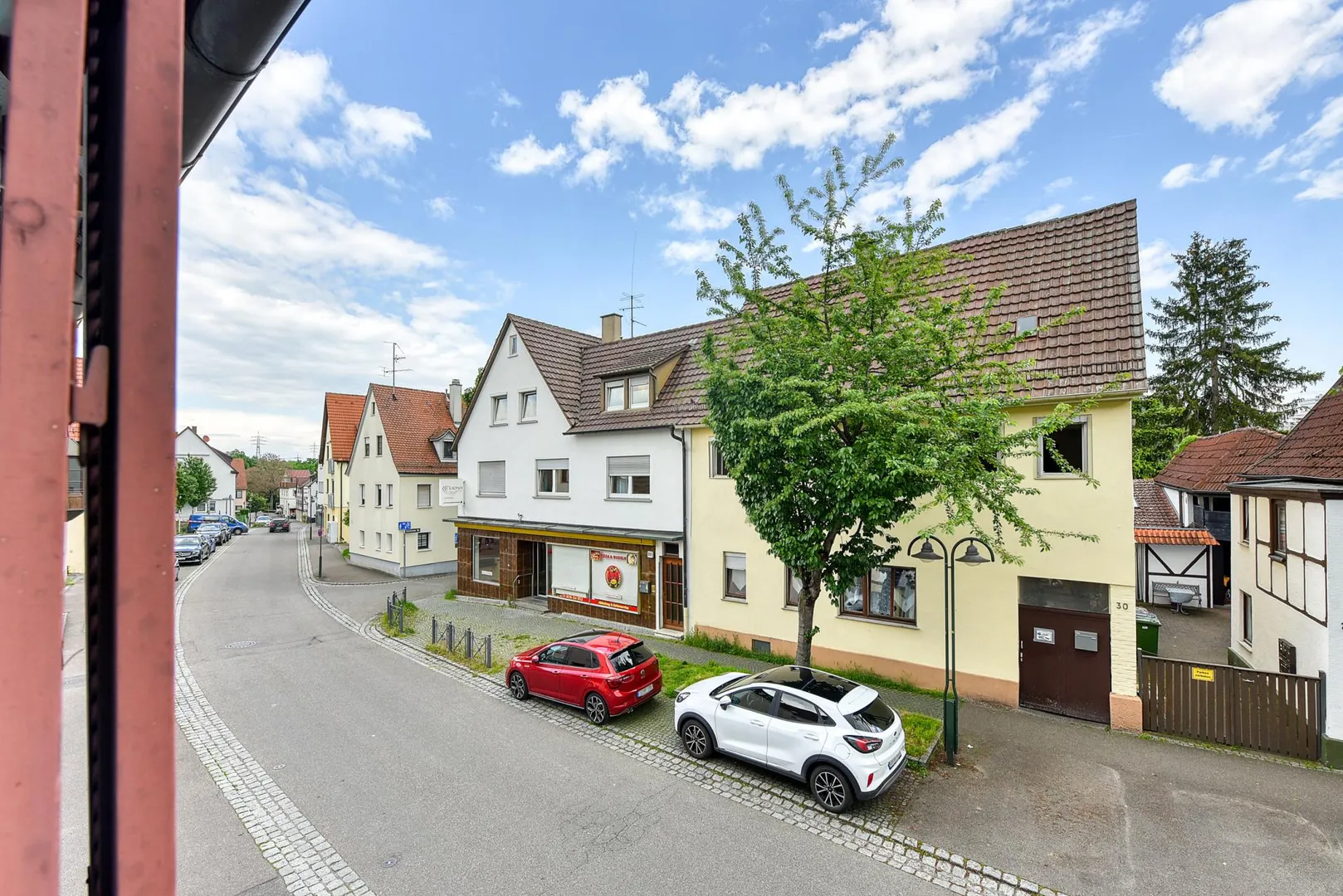Diese gemütliche 2 1/2-Zimmer-Etagen-Wohnung befindet sich im 1. Obergeschoss einer Doppelhaushälfte mit zwei Wohneinheiten im Obergeschoss und im Dachgeschoss sowie einem Einzelhandels-Geschäft im Erdgeschoss.