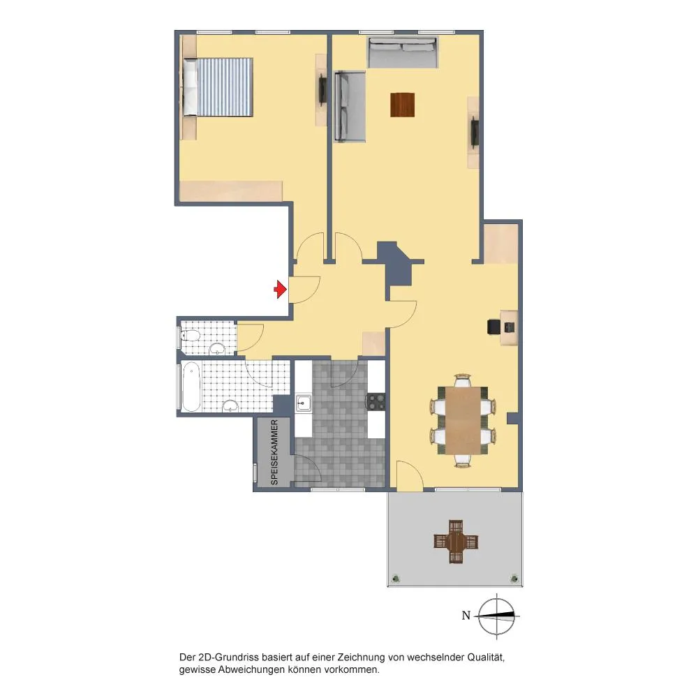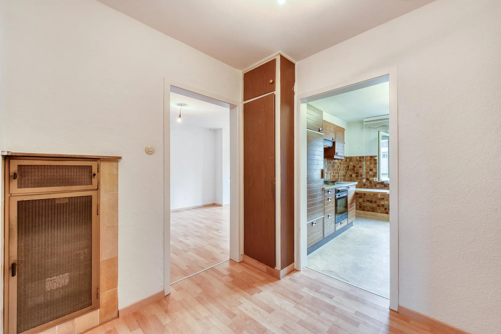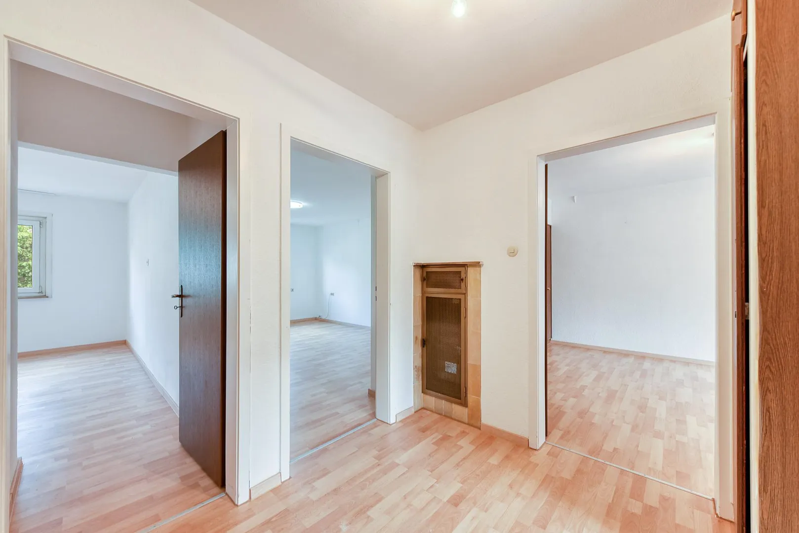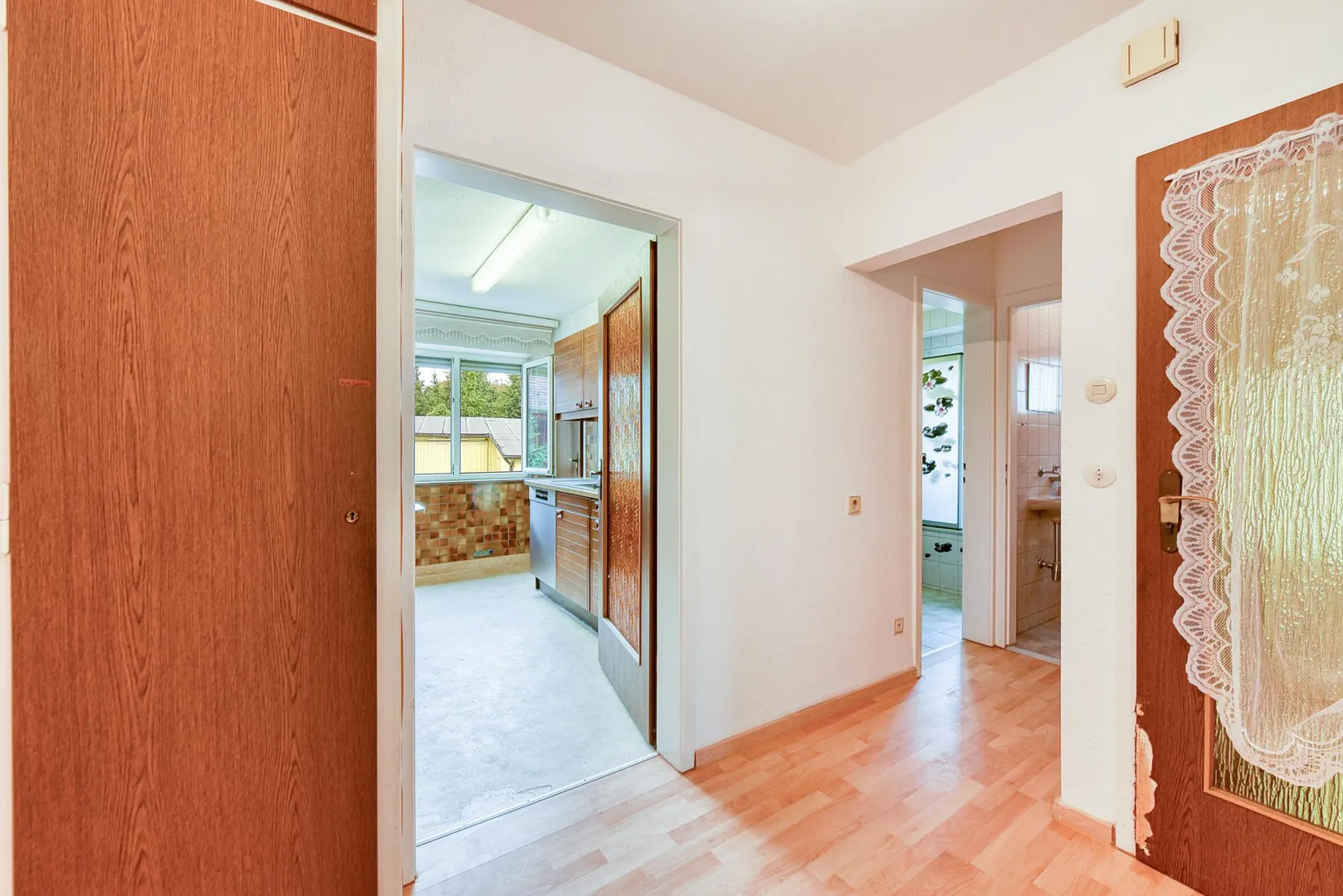 Der Grundriss ist gut: alle Räume sind direkt von der Diele begehbar. Zusätzlich sind das Wohnzimmer ist mit dem Esszimmer mit einem offenen Durchgang verbunden. Das Badezimmer verfügt über ein Fenster. Hinter der Küche befindet sich eine Speisekammer. Das WC mit Fenster ist separat. Der ca. 8,4 m² große West-Balkon mit Markise ist über das Esszimmer begehbar.