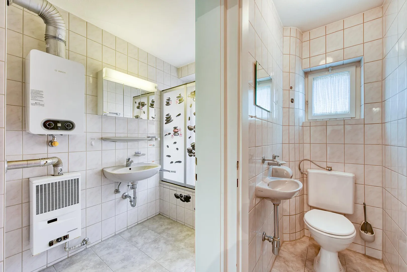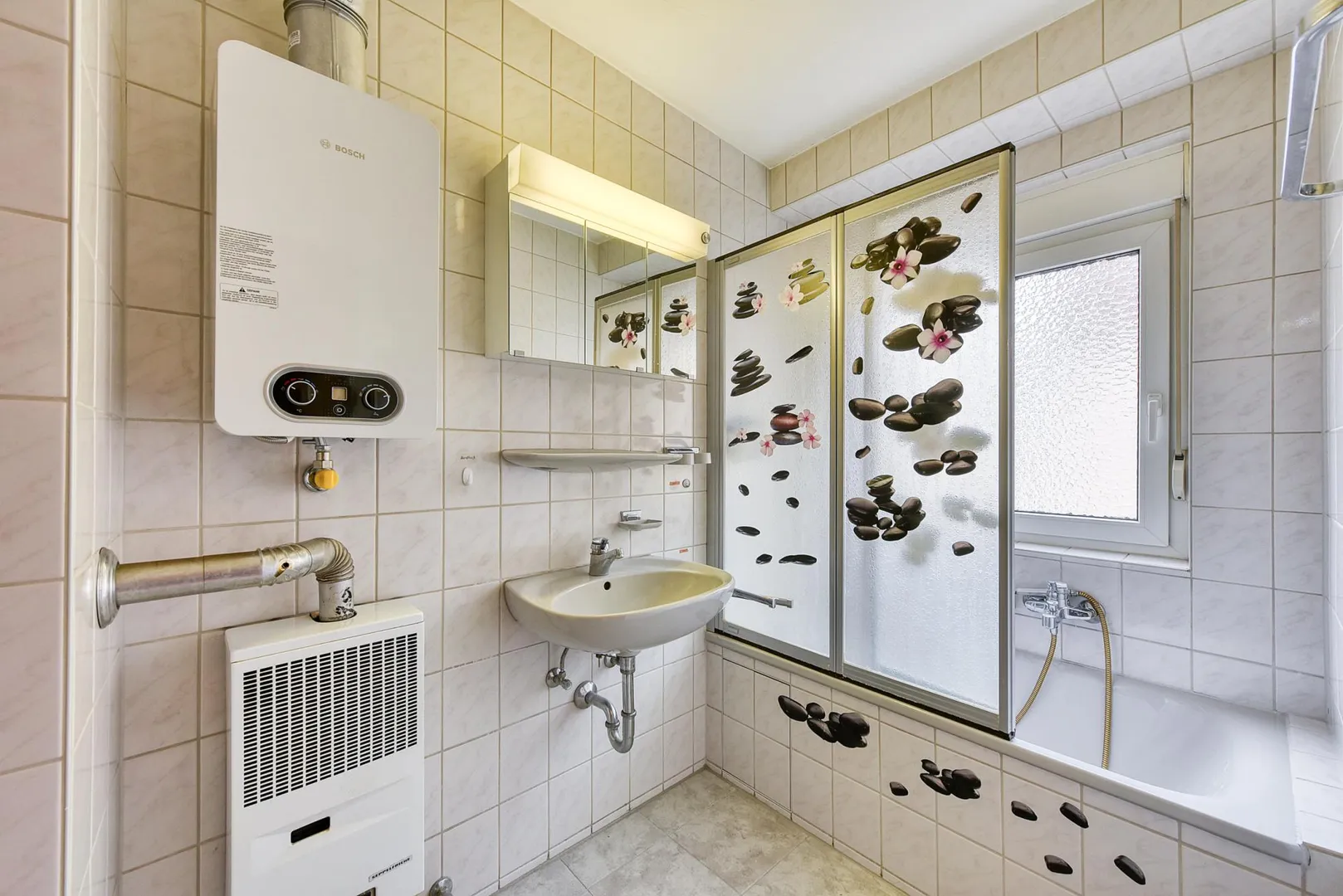 Das raumhoch geflieste Tageslicht-Badezimmer ist ausgestattet mit einer Badewanne mit Duschmöglichkeit, einem belichteten Spiegel, einem Gas-Einzelofen sowie einen Durchlauferhitzer fürs Warmwasser.