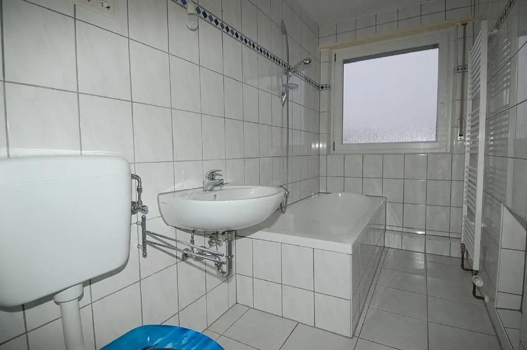 Das Tageslicht-Badezimmer ist raumhoch gefliest. Es ist ausgestattet mit einem Fenster, einer Badewanne, einem WC und einem Handtuchheizkörper.