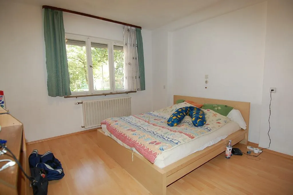 Das Schlafzimmer ist nach Nord-Ost ausgerichtet und verfügt über ältere Holzfenster mit Rollläden.