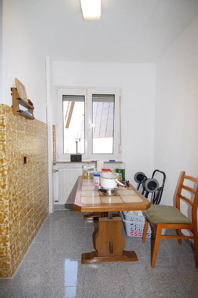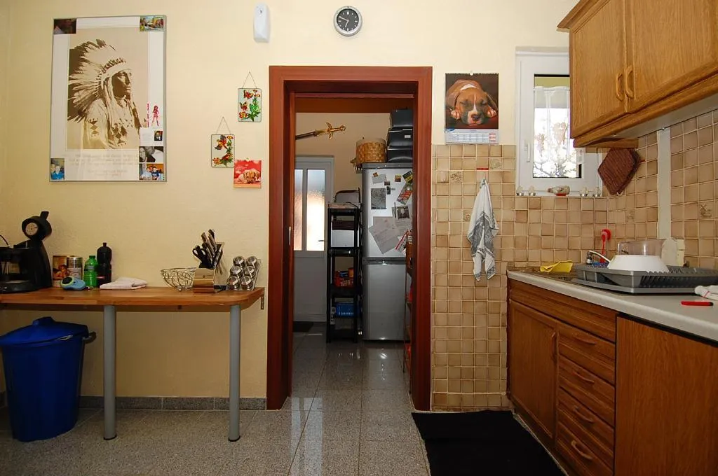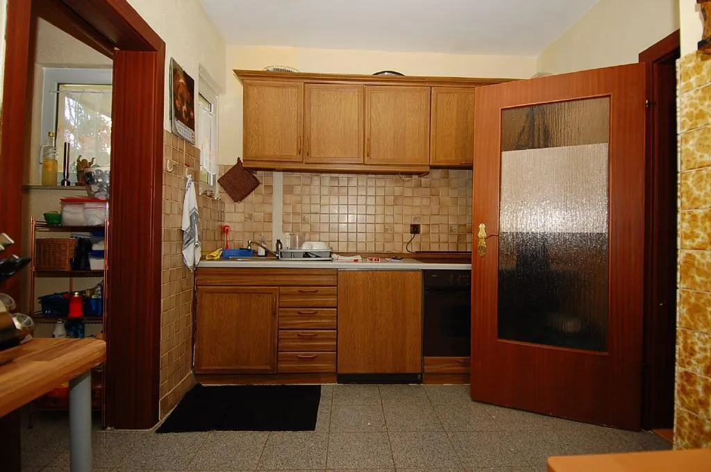 Die ältere und einfache Einbauküche ist mit einen Herd mit Kochfeld, einen Kühlschrank und Ober-/Unterschränke ausgestattet.