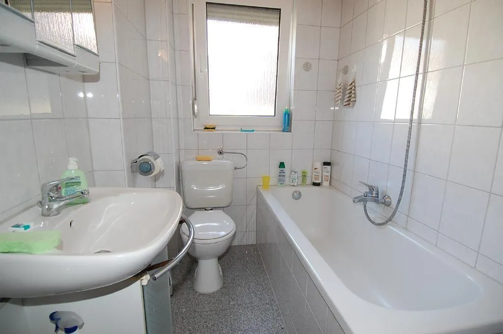 Das Tageslicht-Badezimmer ist raumhoch gefliest und verfügt über eine Wanne, ein WC und ein Fenster.