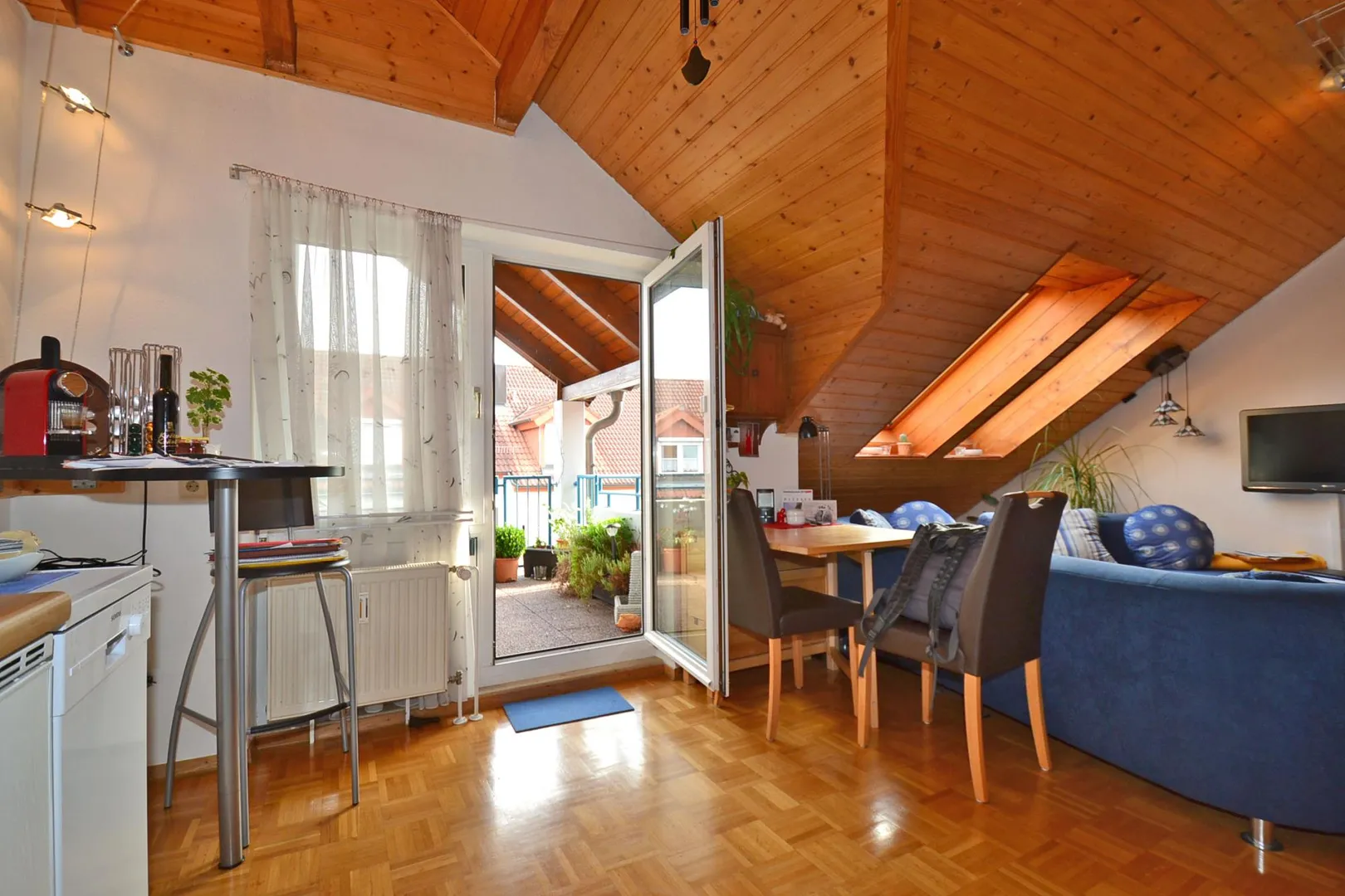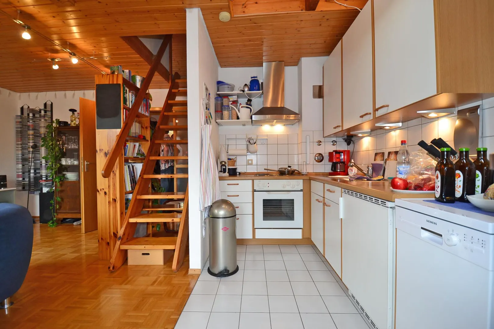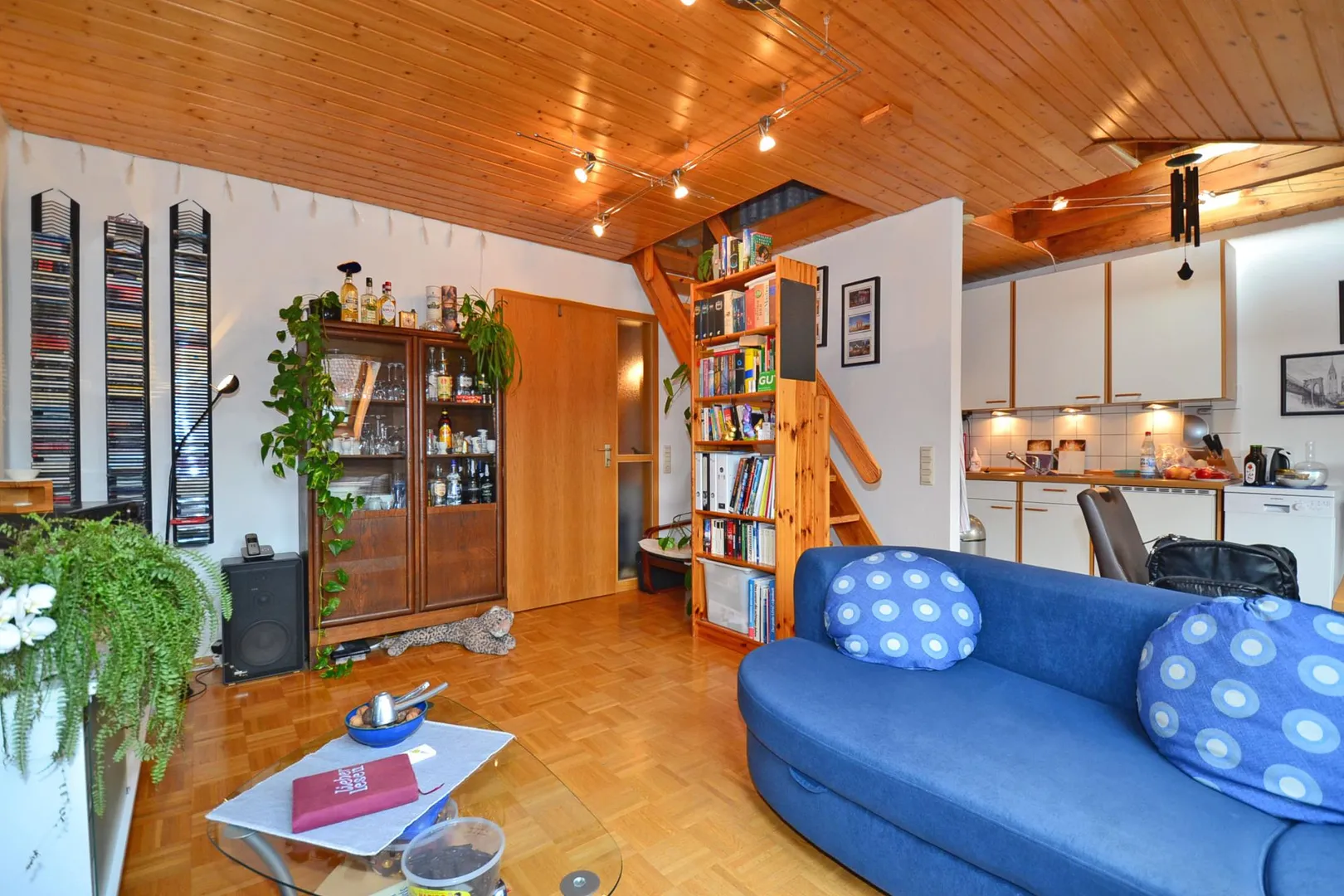 Der Wohnbereich und die Küche sind offen miteinander verbunden.