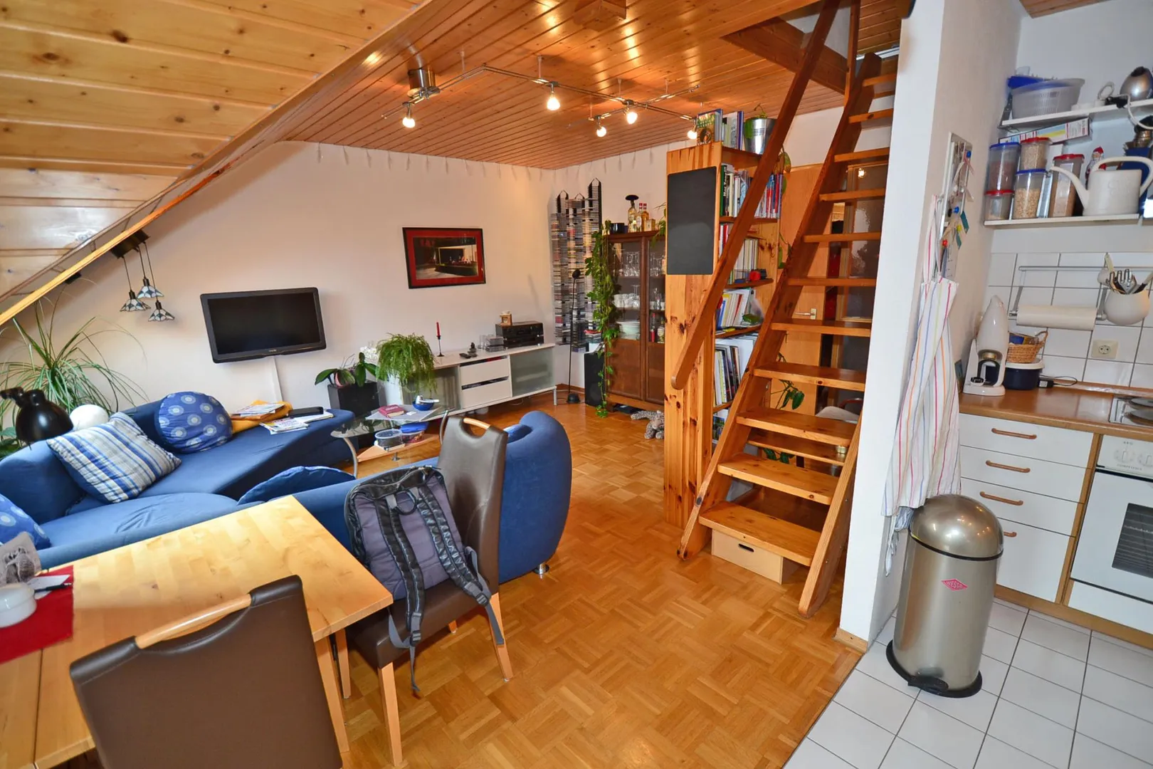 Über eine Holztreppe gelangen Sie in den oberen DG-Raum.