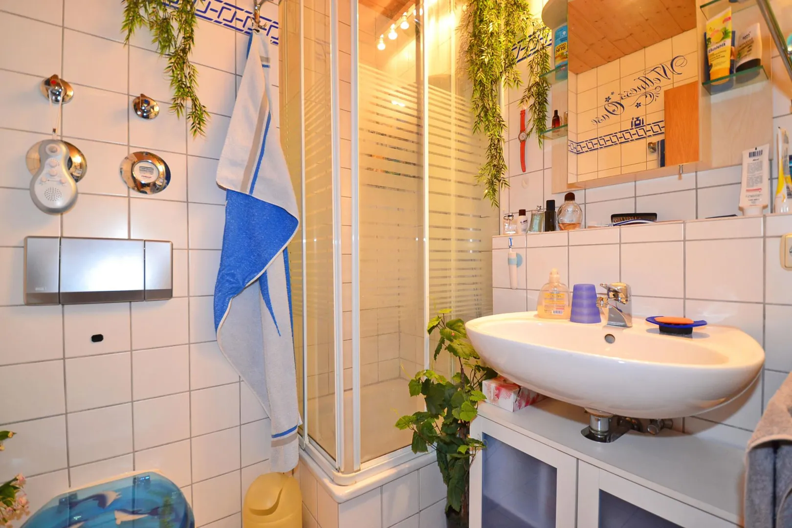 Das kompakte Bad ist raumhoch weiß gefliest und mit Dusche, Waschbecken, WC und elektrischer Abluft ausgestattet.