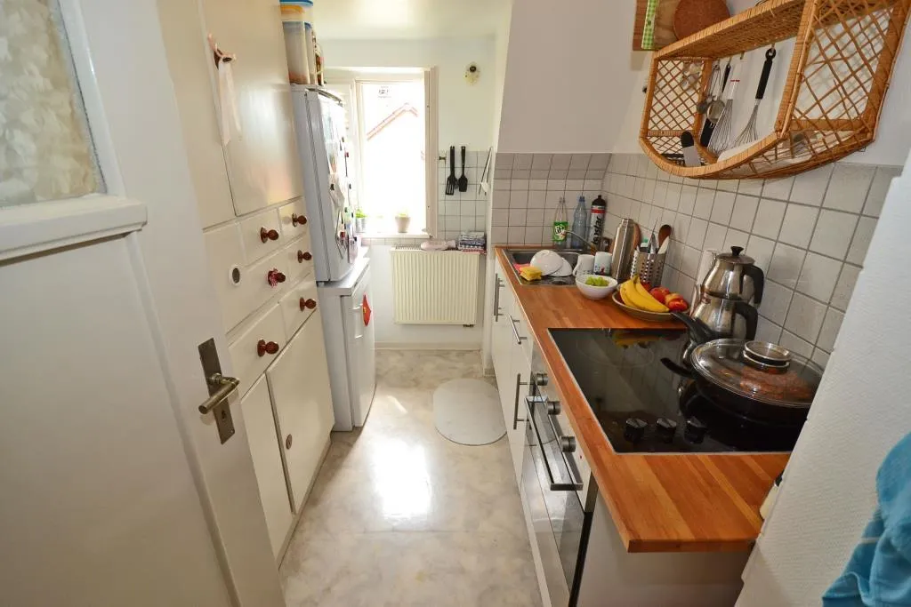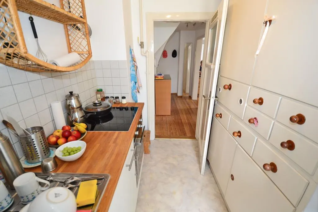 Die Küche ist ausgestattet mit Einbauschränken auf der linken Seite. Auf der rechten Seite befindet sich eine Küchenzeile mit Spüle, Herd mit Backofen sowie Unterschränken. Diese Küchenzeile kann von den Vormietern für 500 EUR (VB) übernommen werden.