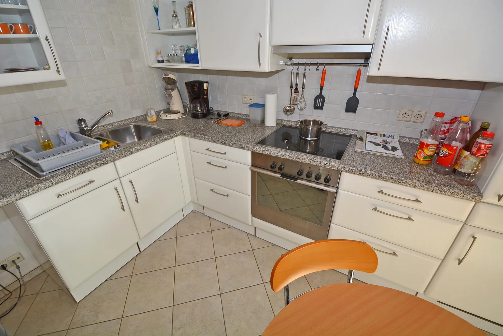 Die offene Küche ist mit einer Einbauküche ausgestattet. Die Einbauküche ist ausgestattet mit einem Kühlschrank mit Gefrierfach, einem Herd mit Dunstabzug, einem Backofen, einer Spüle sowie Unter- und Oberschränken. Eine Spülmaschine ist nicht vorhanden.