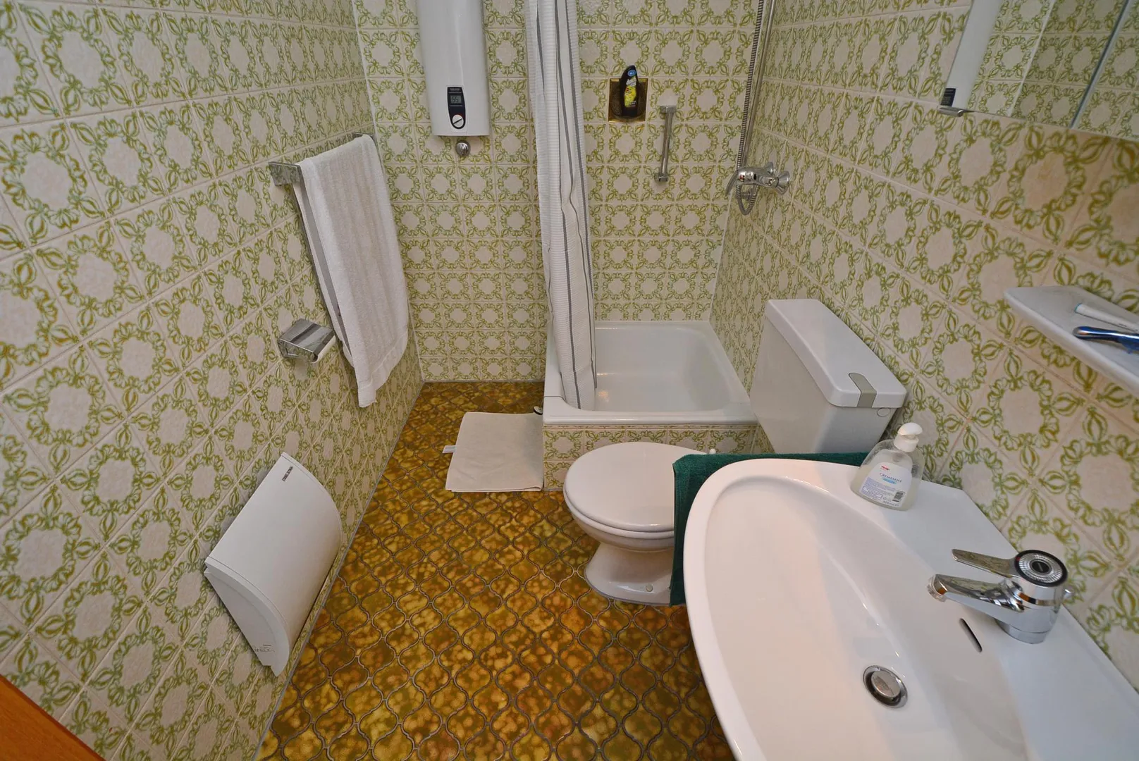 Das raumhoch geflieste Retro-Badezimmer ist ausgestattet mit einer Dusche, einem WC, einem Spiegelschrank sowie einem Waschmaschinenanschluss.