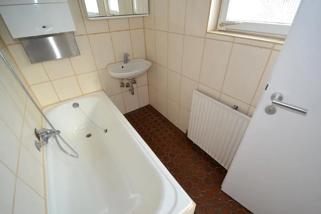 Das ¾ -hoch geflieste Tageslicht-Badezimmer wurde ca. 2013 modernisiert, ist über die Küche begehbar und verfügt über einen Fliesenboden, eine Badewanne, ein Waschbecken mit Spiegelschrank sowie über einen Waschmaschinenanschluss.
