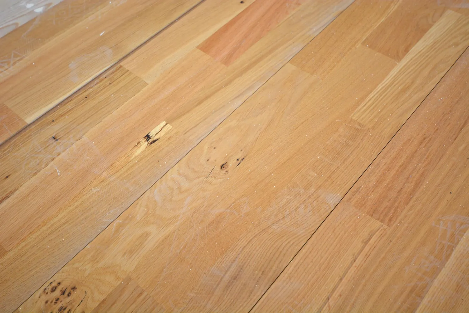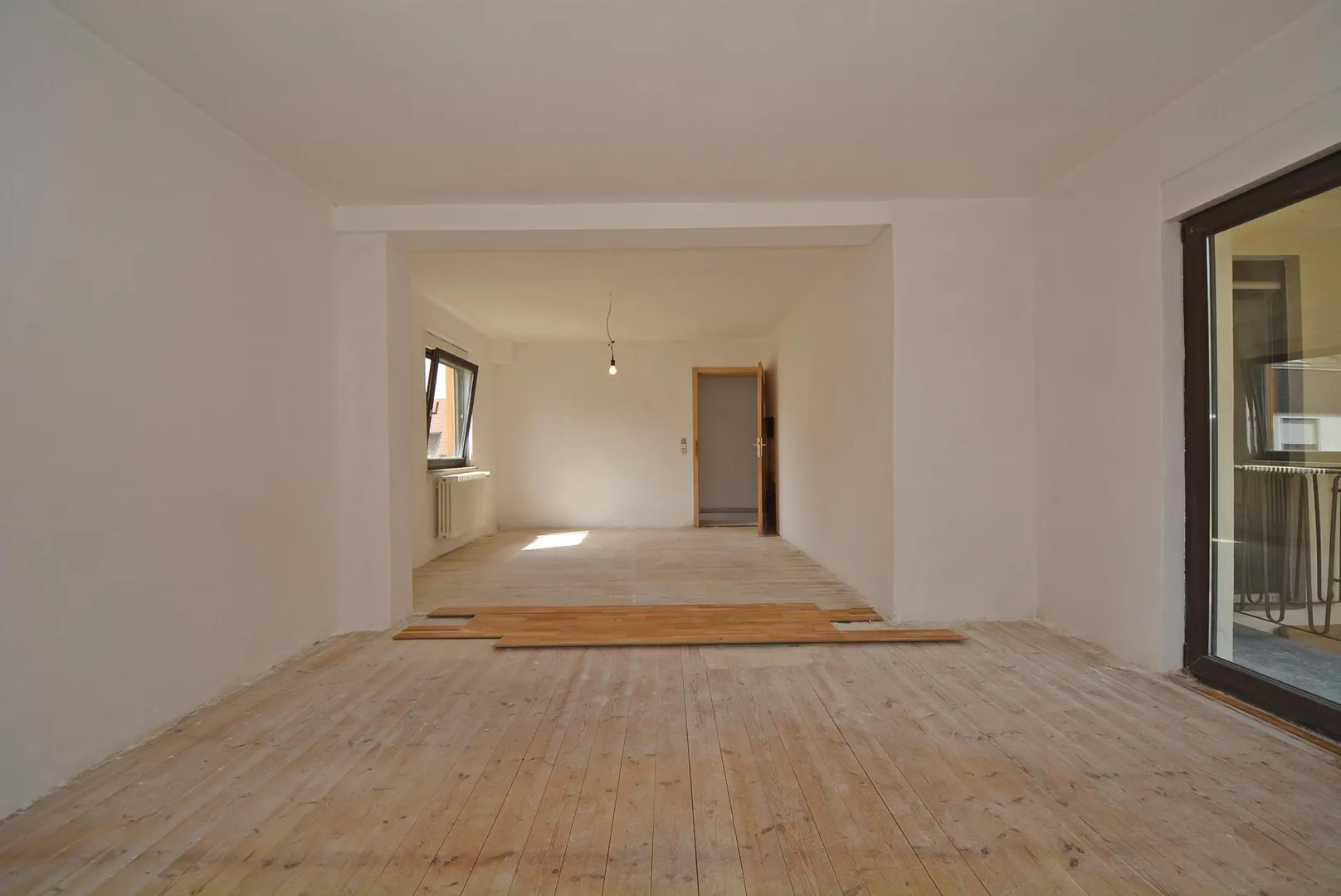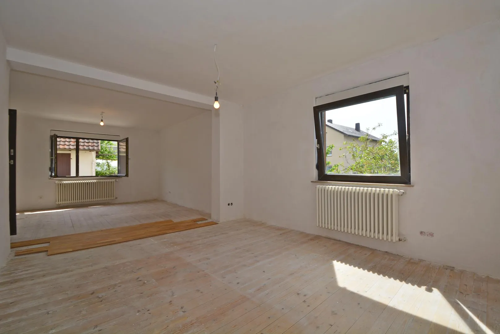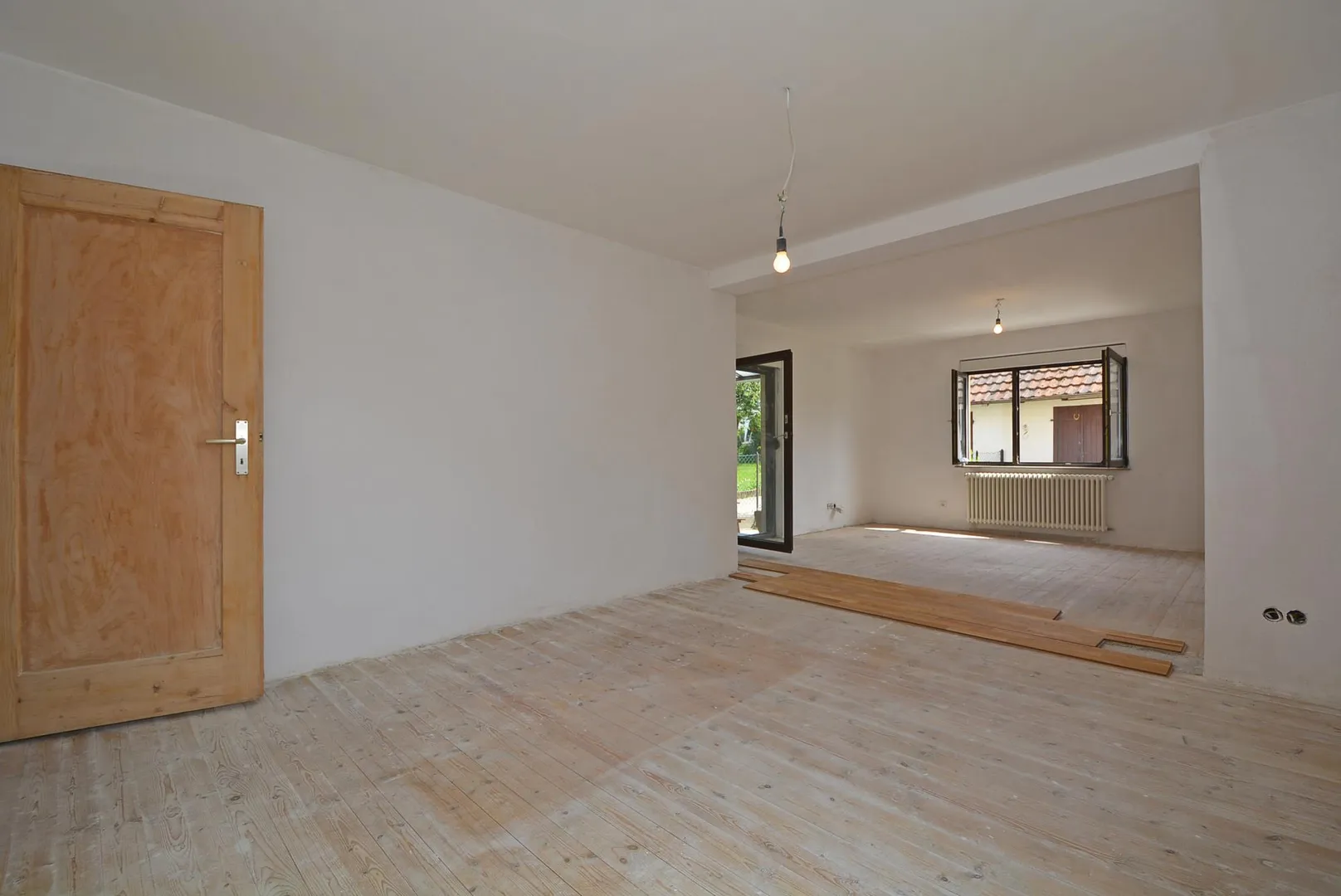 In Wohn-/Esszimmer und Schlafzimmer wird neuer Eiche-Parkettboden verlegt.