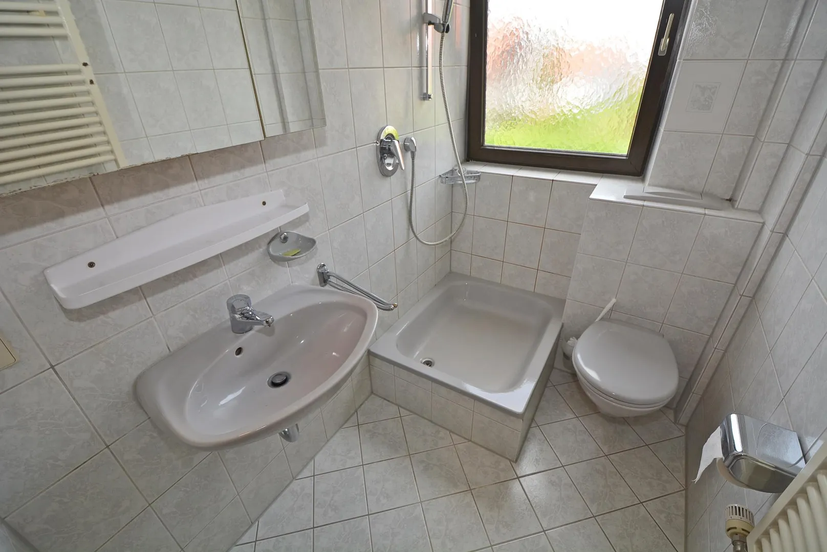 Das Bad ist raumhoch gefliest und mit Dusche, Handtuchhalter-Heizkörper, Waschbecken, WC und Fenster ausgestattet.