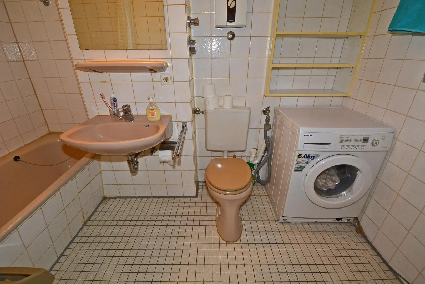 Das ¾ -hoch geflieste Badezimmer ist mit einer Wanne, einem Waschbecken, einem WC sowie einem Waschmaschinenanschluss ausgestattet.
