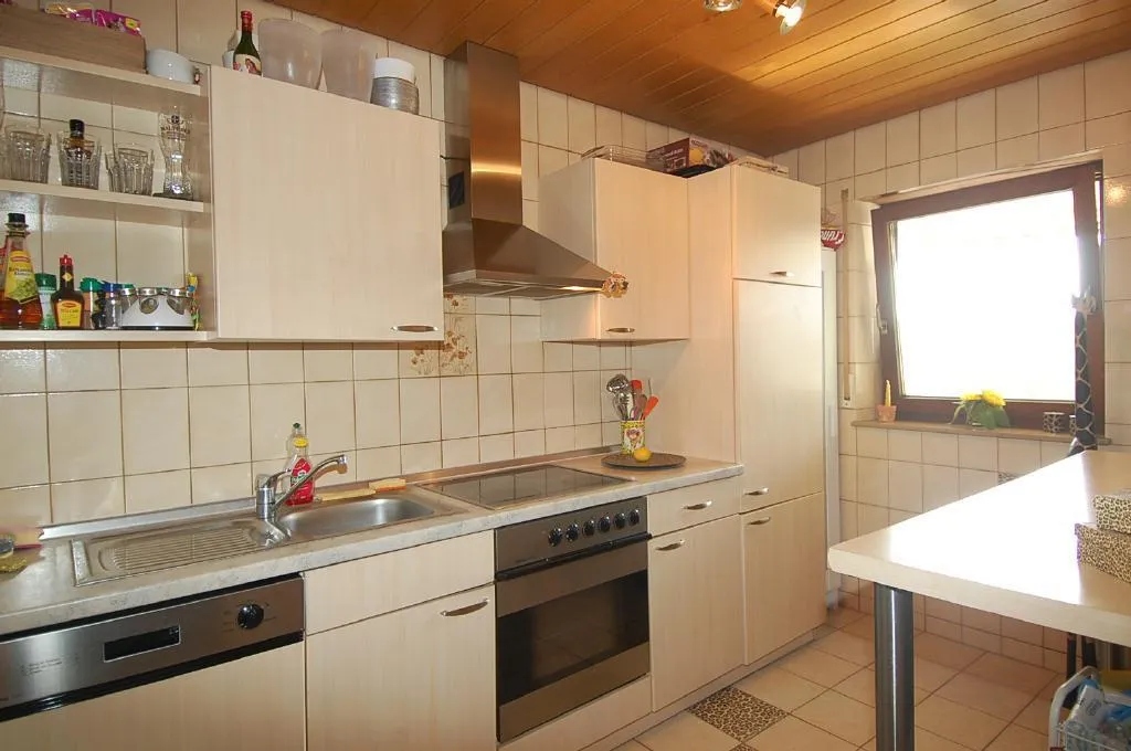 Der Küchenboden ist gefliest. Die Küche verfügt über eine Einbauküche, welche mit allen notwendigen Elektro-Geräten ausgestattet ist.