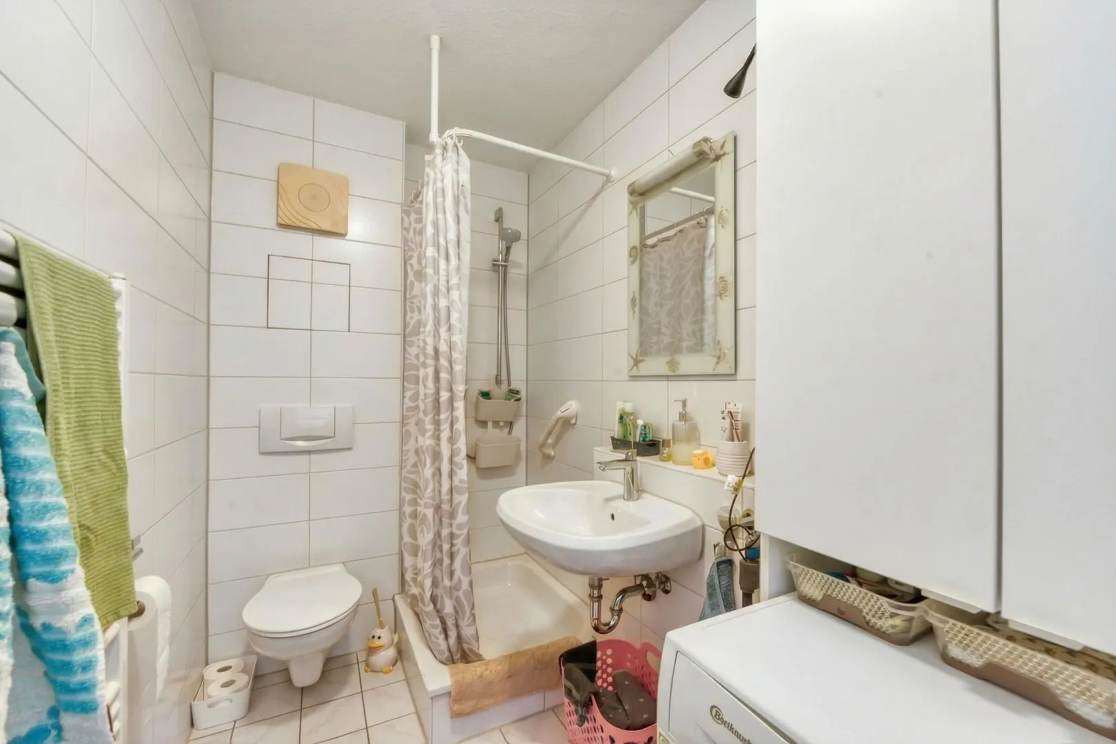 Das raumhoch geflieste Badezimmer ist ausgestattet mit einer Dusche, einem WC, einem Waschmaschinen-Anschluss sowie einem Handtuch-Heizkörper.