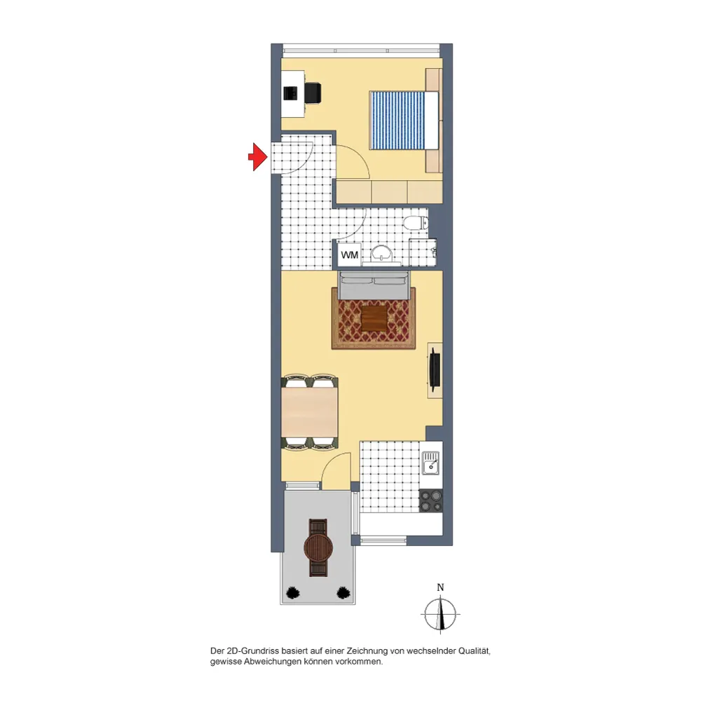 Der Grundriss der Wohnung ist offen gestaltet: der Flur-, Wohn-, Ess- und Küchenbereich ist offen. Das Badezimmer ist innenliegend. Der ca. 6 m² große und überdachte Balkon ist über den Wohnbereich begehbar.