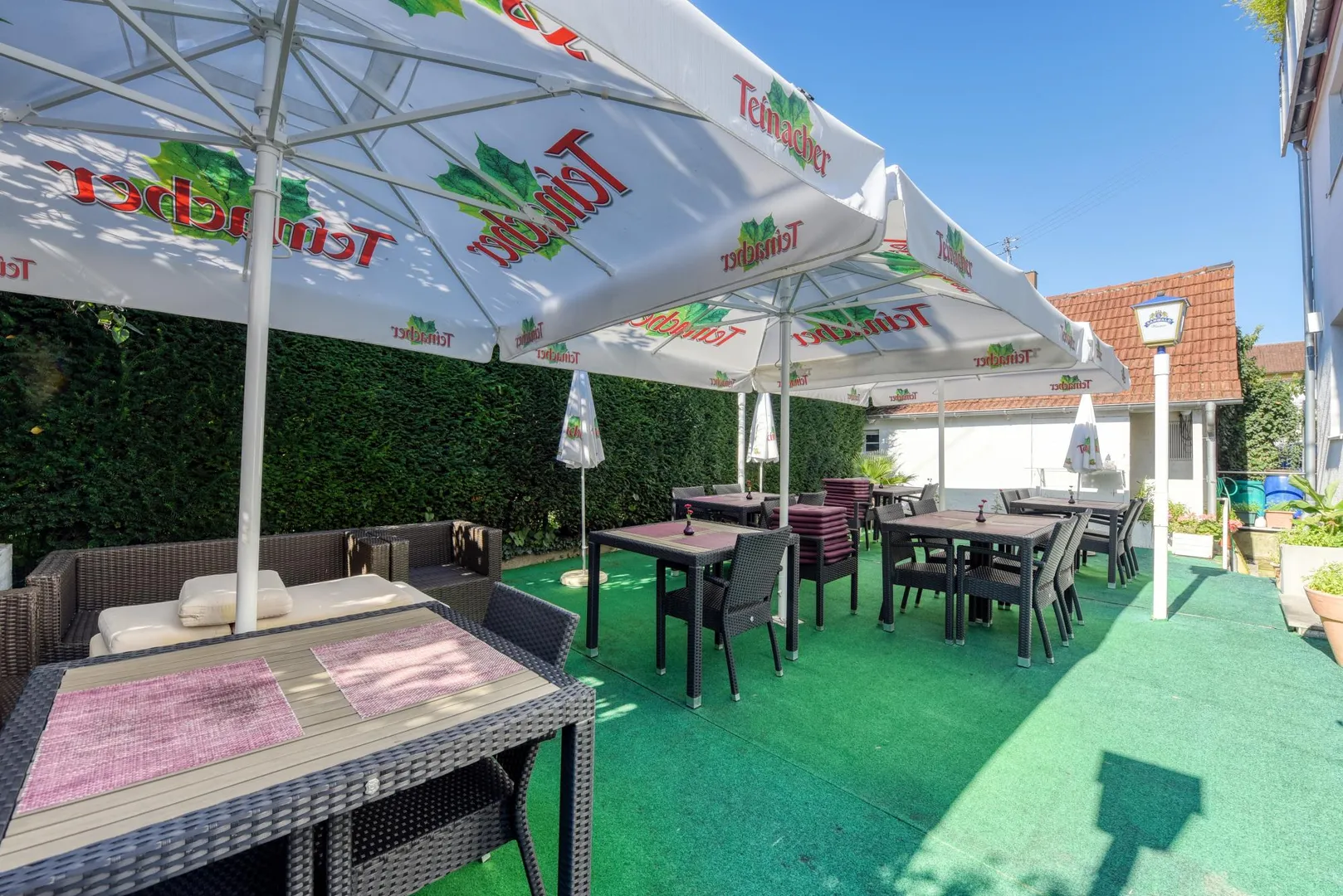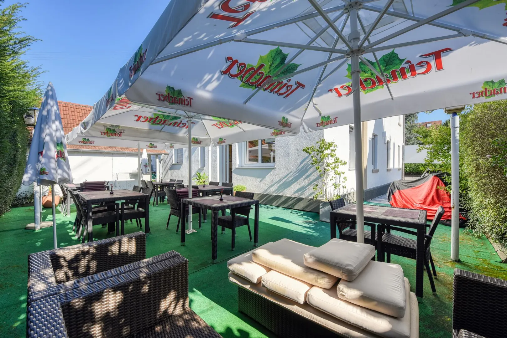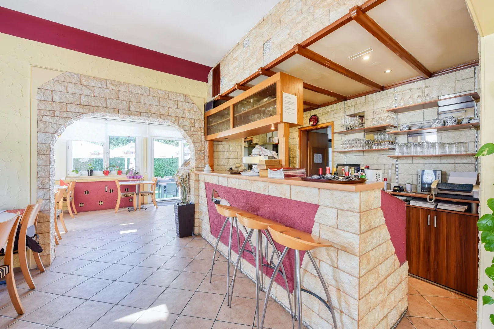 Zum Restaurant gehören die Außenterrasse, ein Kühlraum sowie ein Abstellraum im Untergeschoss.