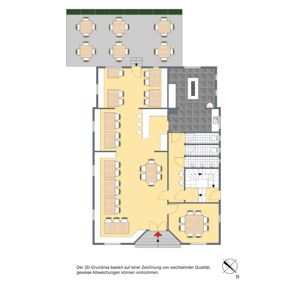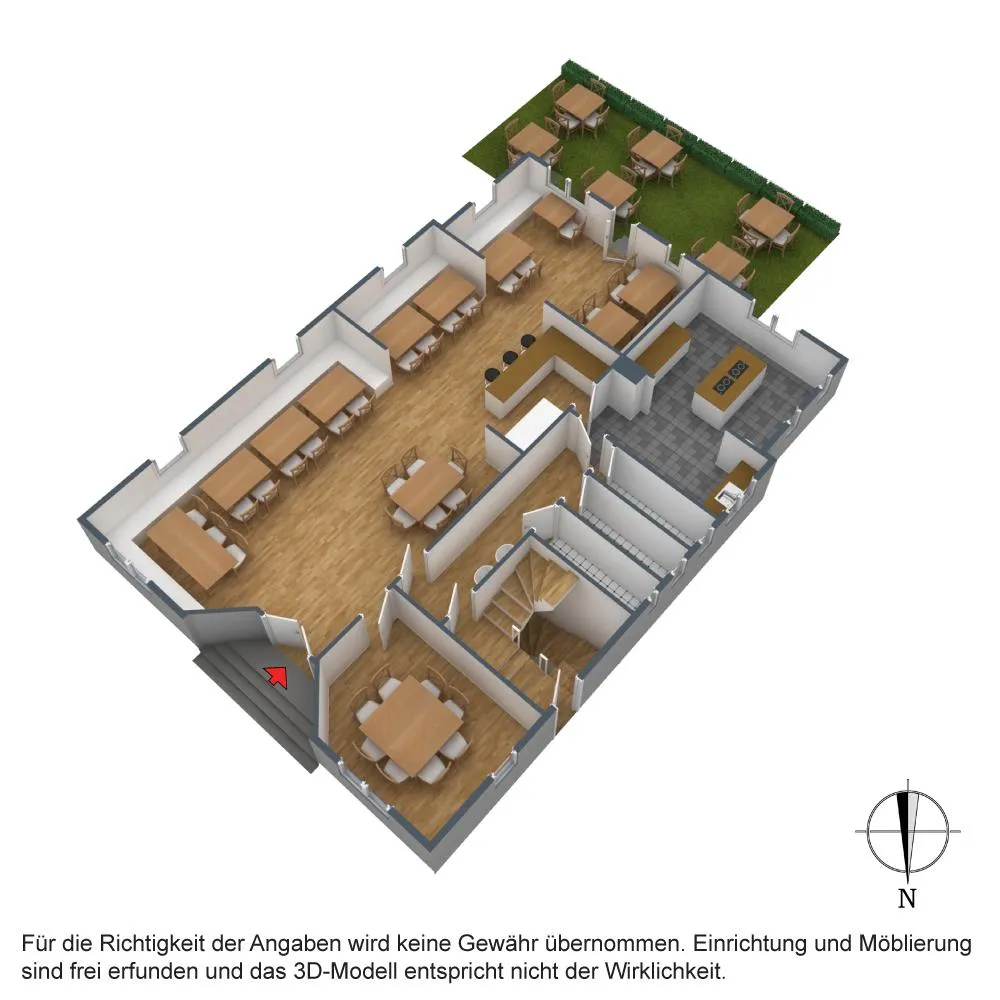 Im Innenbereich sind es ca. 130 m² Nutzfläche. Der Innenbereich besteht aus einem großzügigen Gastraum mit ca. 80 m², einem Nebenraum mit ca. 13 m², einer Küche, jeweils ein Herren- und Damen-WC mit Fenster sowie einem WC mit 3 Pissoirs.