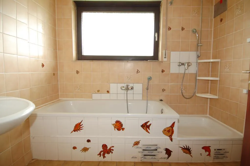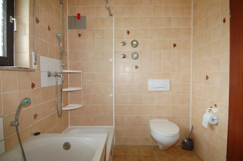 Im Flur, in der Küche, im Wohnzimmer, im WC und im Badezimmer wurde ein Fliesenboden verlegt. Im Schlaf- und Arbeitszimmer ist Laminat verlegt. Das Badezimmer ist raumhoch gefliest und ausgestattet mit einem Fenster, einer Wanne, einer Dusche und einem WC.