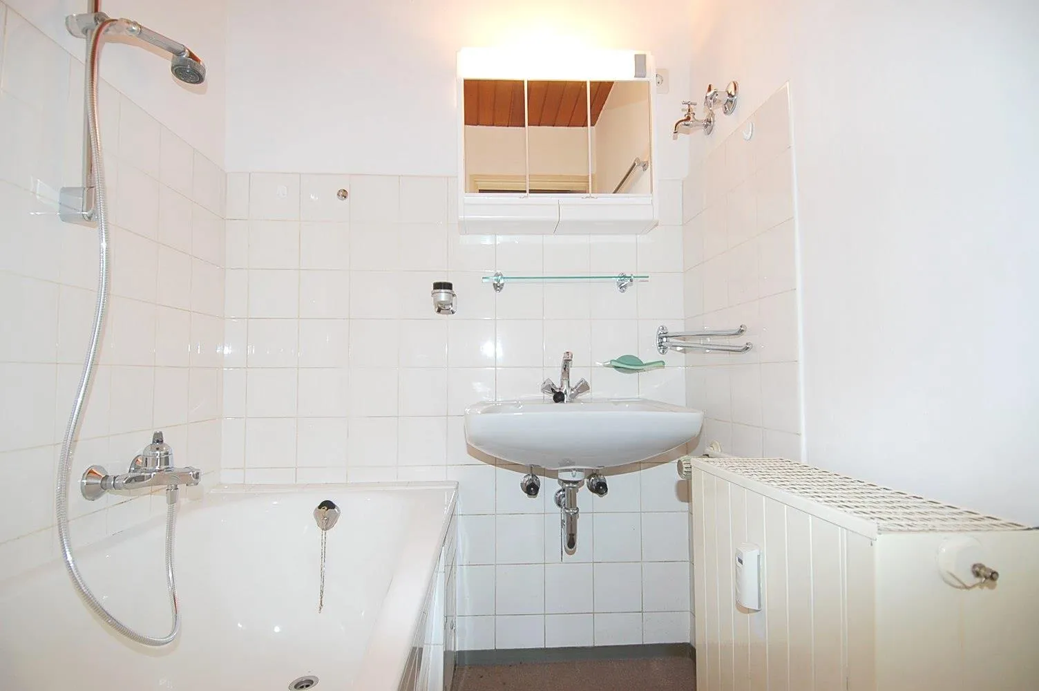 Das innenliegende Badezimmer ist halbhoch weiß gefliest und verfügt über eine Wanne mit Duschmöglichkeit und einen Spiegelschrank mit Waschbecken. Das WC ist separat.