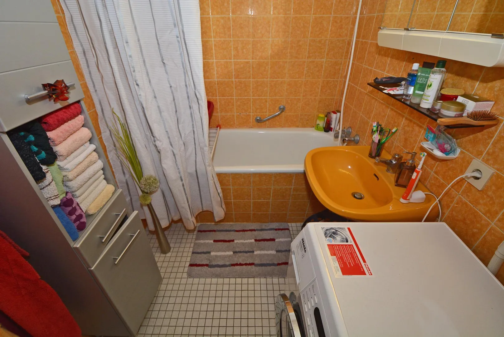 Das Badezimmer ist halbhoch gefliest und mit einer Badewanne, einem Waschbecken sowie einem Waschmaschinenanschluss ausgestattet.