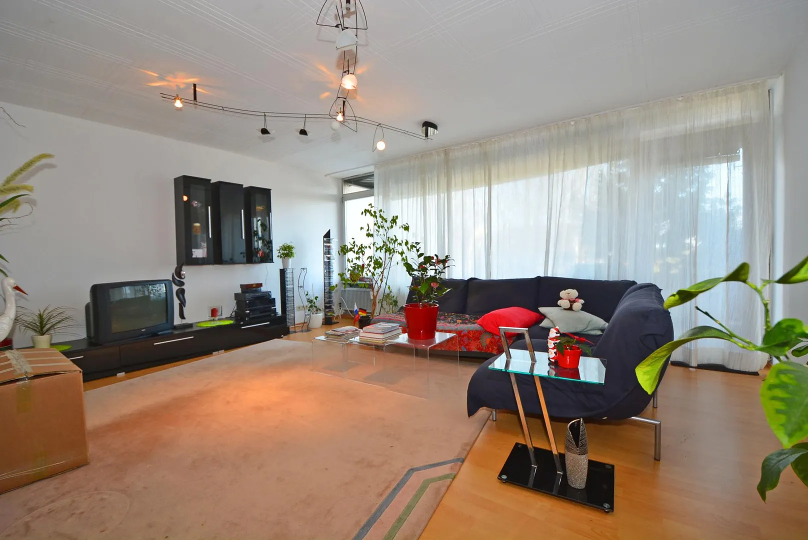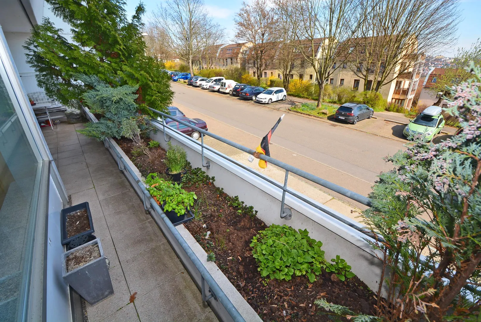 Der teilweise überdachte Süd/Ost-Balkon mit Fernsicht ist vom Wohnzimmer begehbar. Über die ganze Balkonbreite gibt es ein großzügiges Blumen- und Pflanzenbeet.