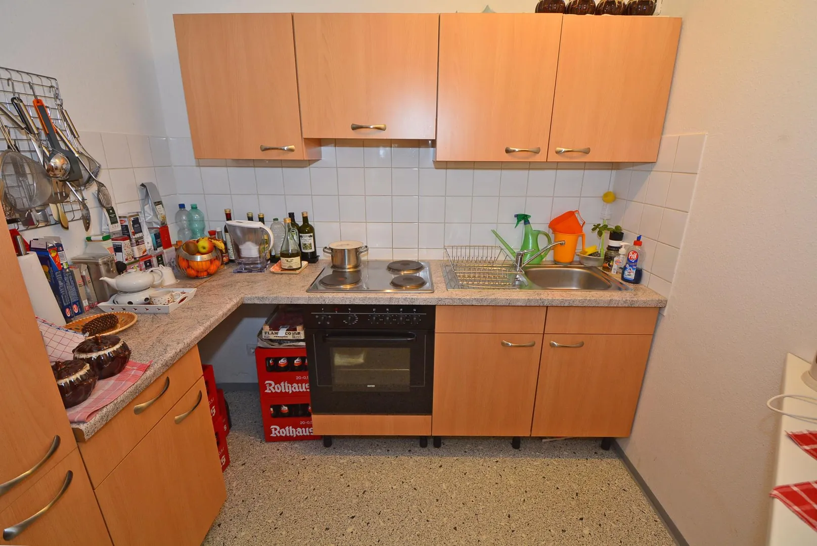 Die Einbauküche kann vom Vormieter übernommen werden. Die Einbauküche beinhaltet einen Kühlschrank, einen elektrischen Herd mit vier Kochplatten, einen Backofen, einen Dunstabzug sowie Ober- und Unterschränke.