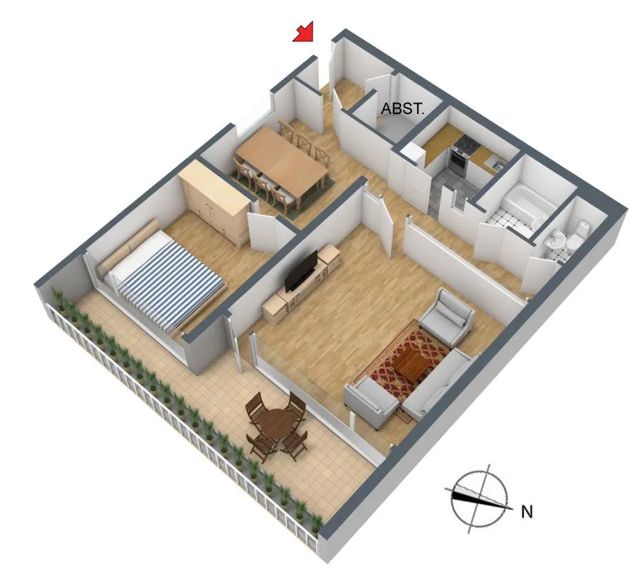 Der Grundriss der Wohnung ist gut. Von der Diele aus sind der Abstellraum sowie das Esszimmer begehbar. Über das Esszimmer aus ist das Schlafzimmer, das Wohnzimmer, die Küche, das Bad sowie das separate WC begehbar.
