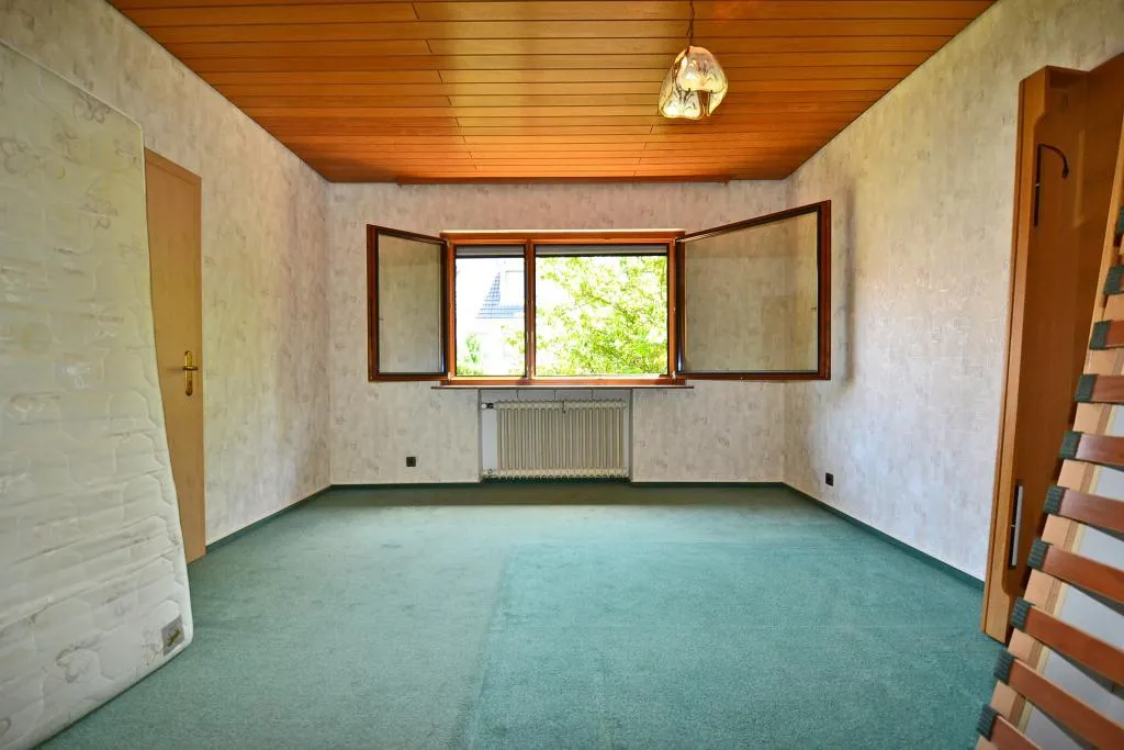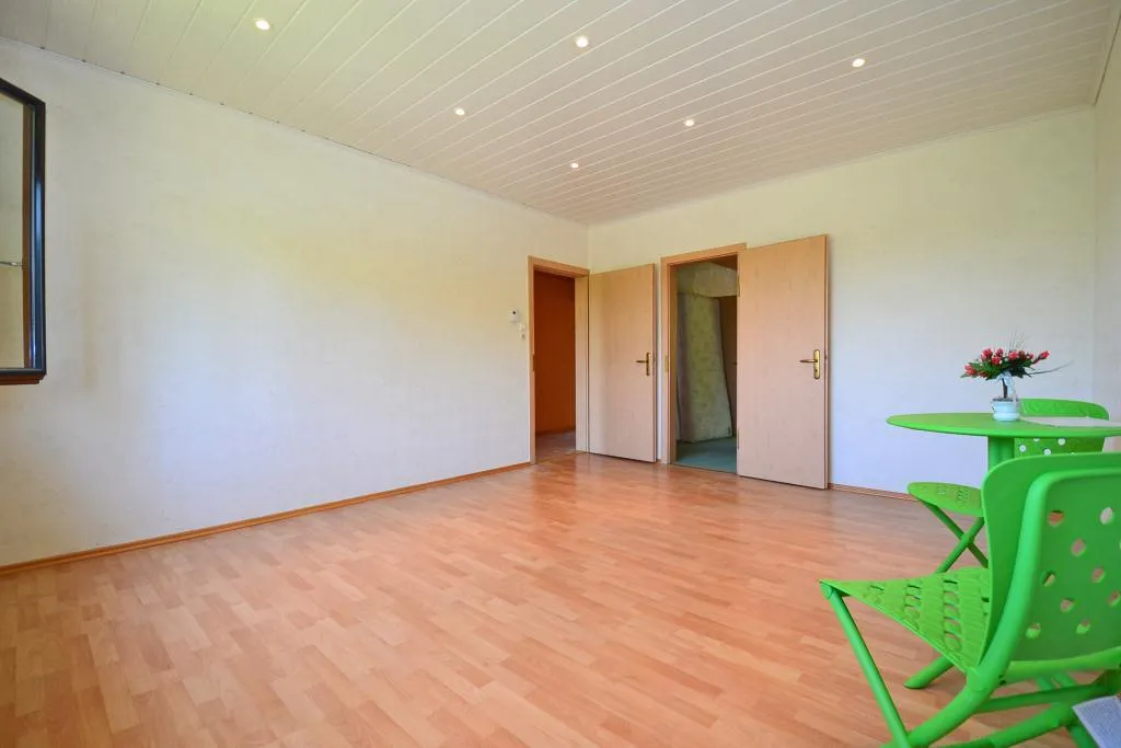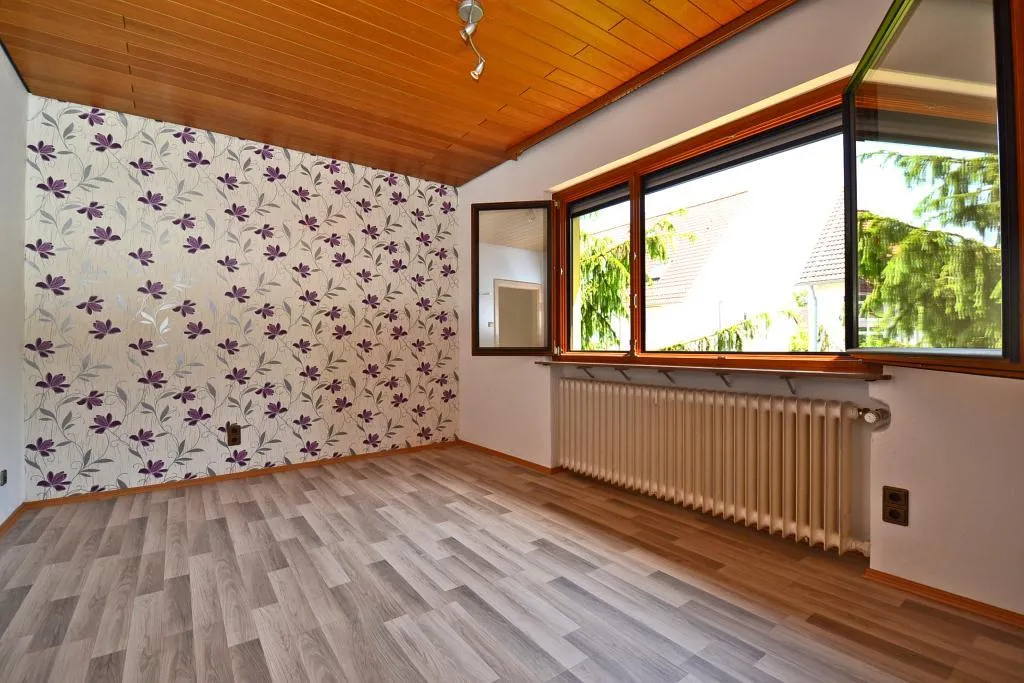Der Flur und zwei Zimmer sind mit Laminatböden ausgestattet. Im Schlafzimmer ist Teppichboden verlegt. Die Wände sind tapeziert. Die Decken sind überwiegend mit braunen Holzdecken ausgestattet. Die Raumhöhe beträgt ca. 2,65 Meter.