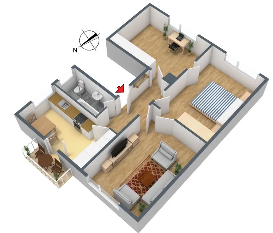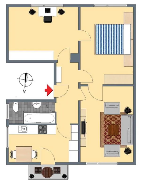 Der Grundriss der Wohnung ist gut. Alle Räume sind direkt vom Flur begehbar. Das Badezimmer verfügt über ein Fenster. Der kleine Balkon ist über die Küche begehbar.