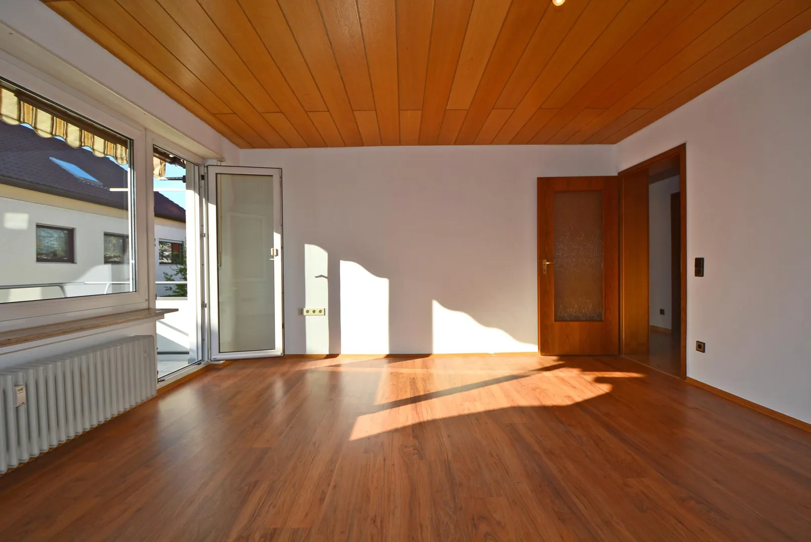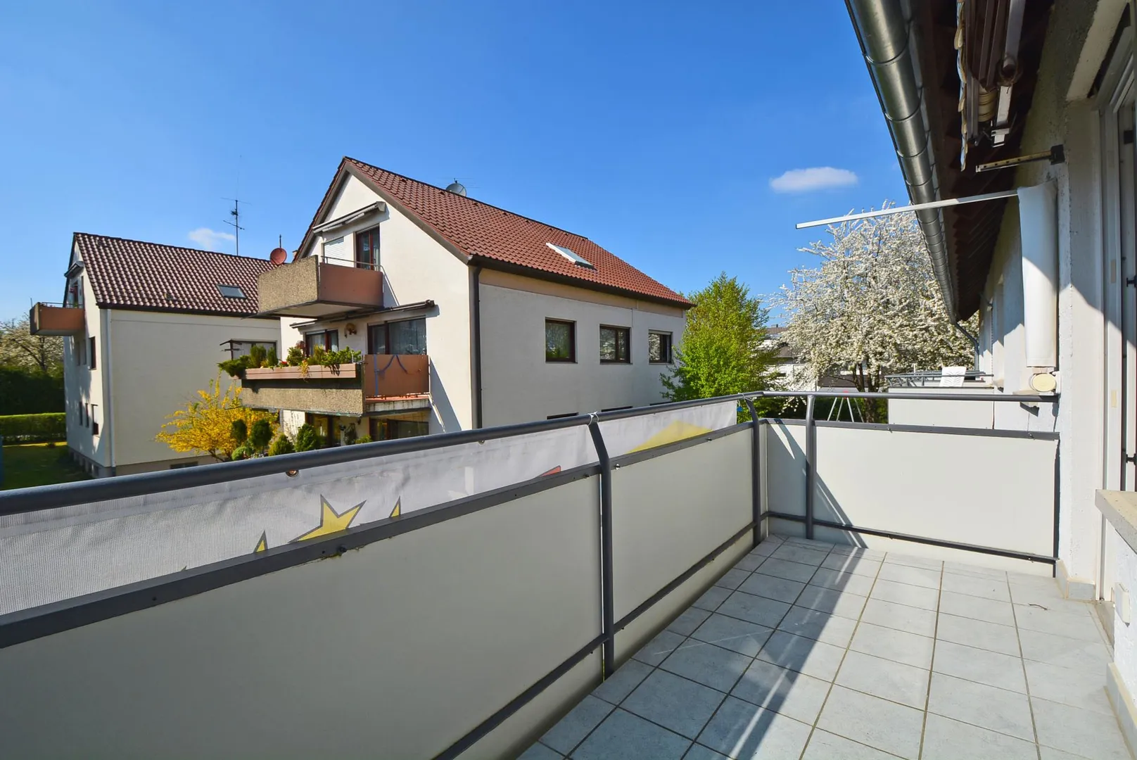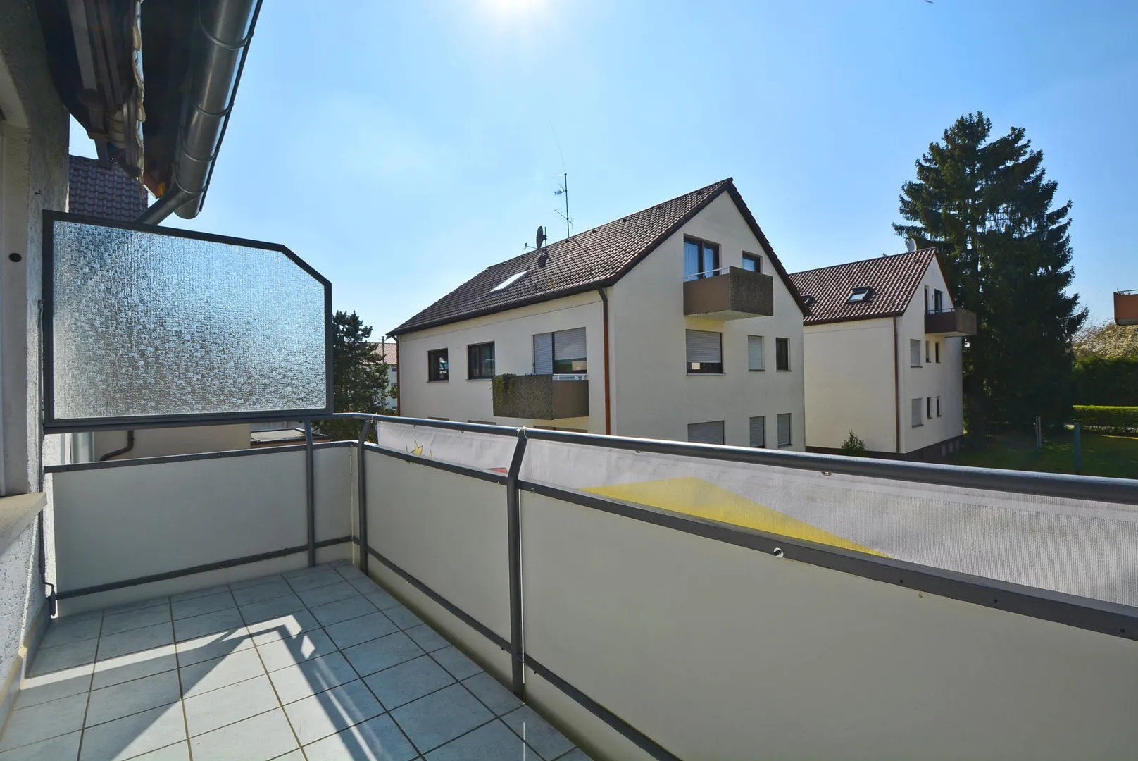 Der ca. 5 m² große West-Balkon ist vom Wohnzimmer begehbar und mit einer Markise ausgestattet.