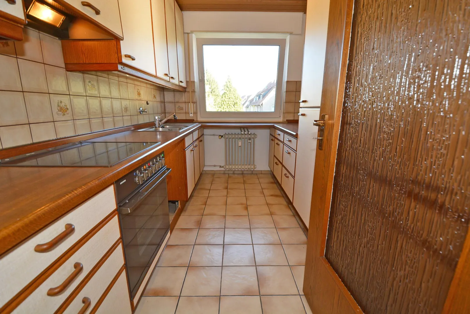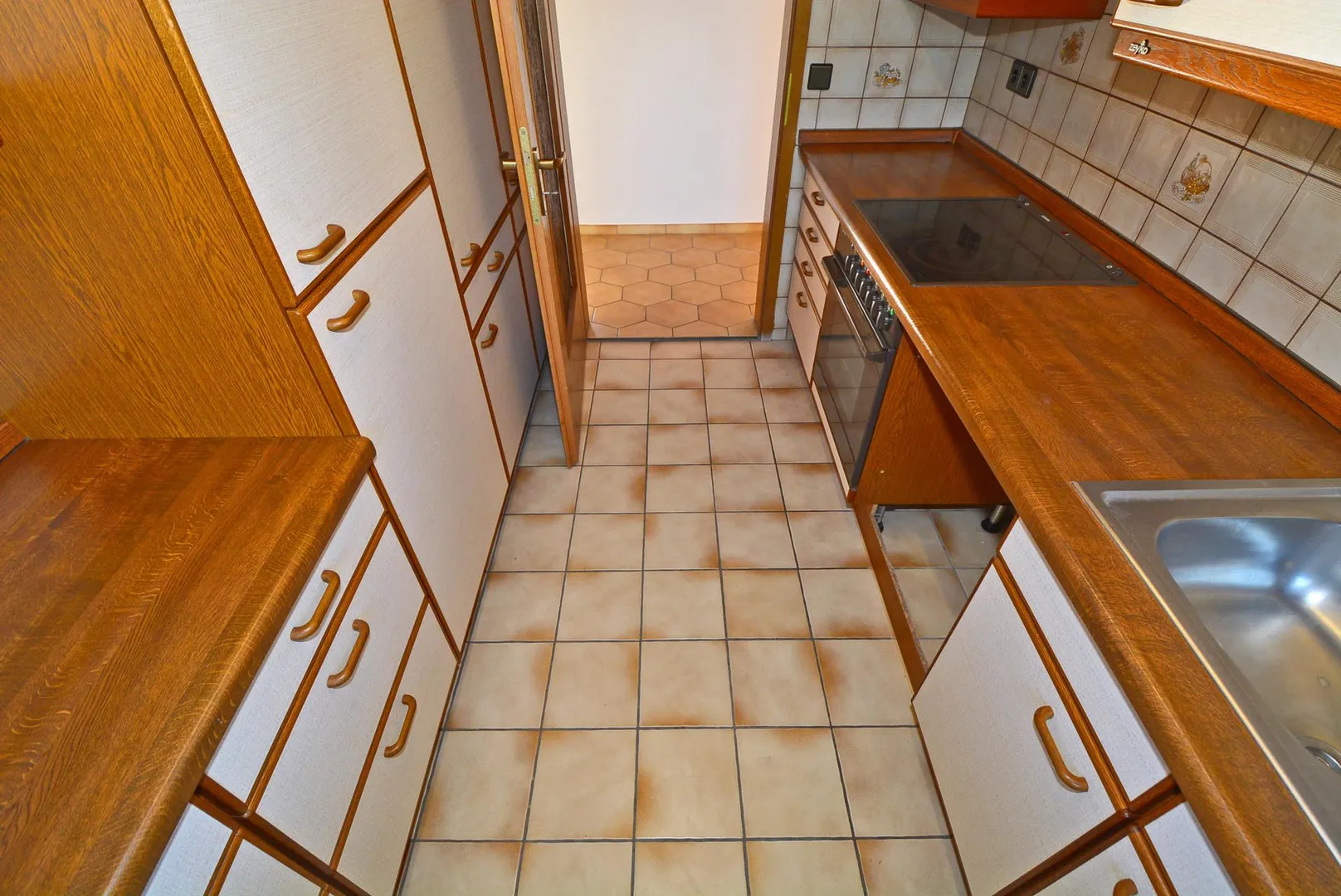 Die Küche ist mit einer Einbauküche ausgestattet. Die Einbauküche beinhaltet einen Kühl-/Gefrierschrank, einen Ceran-Herd mit Backofen, einen Dunstabzug sowie Ober- und Unterschränke. Eine Spülmaschine ist nicht enthalten. Hierfür sind Platz und Anschlussmöglichkeit vorhanden.