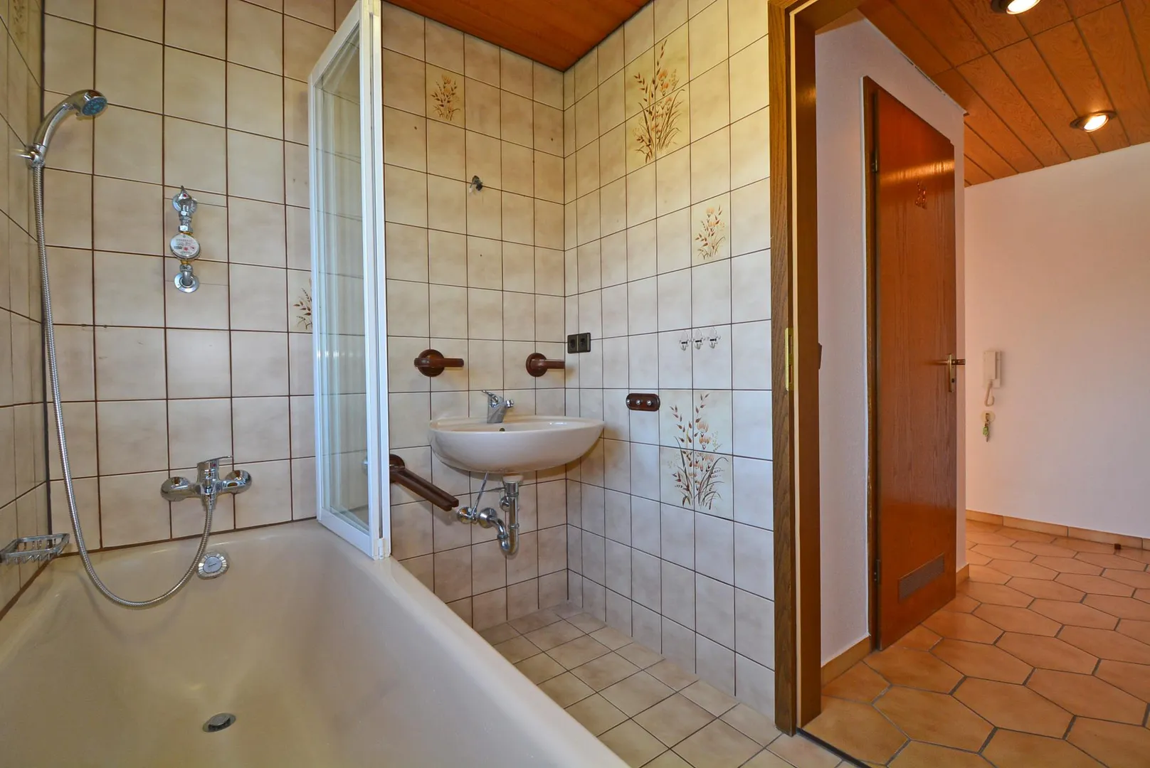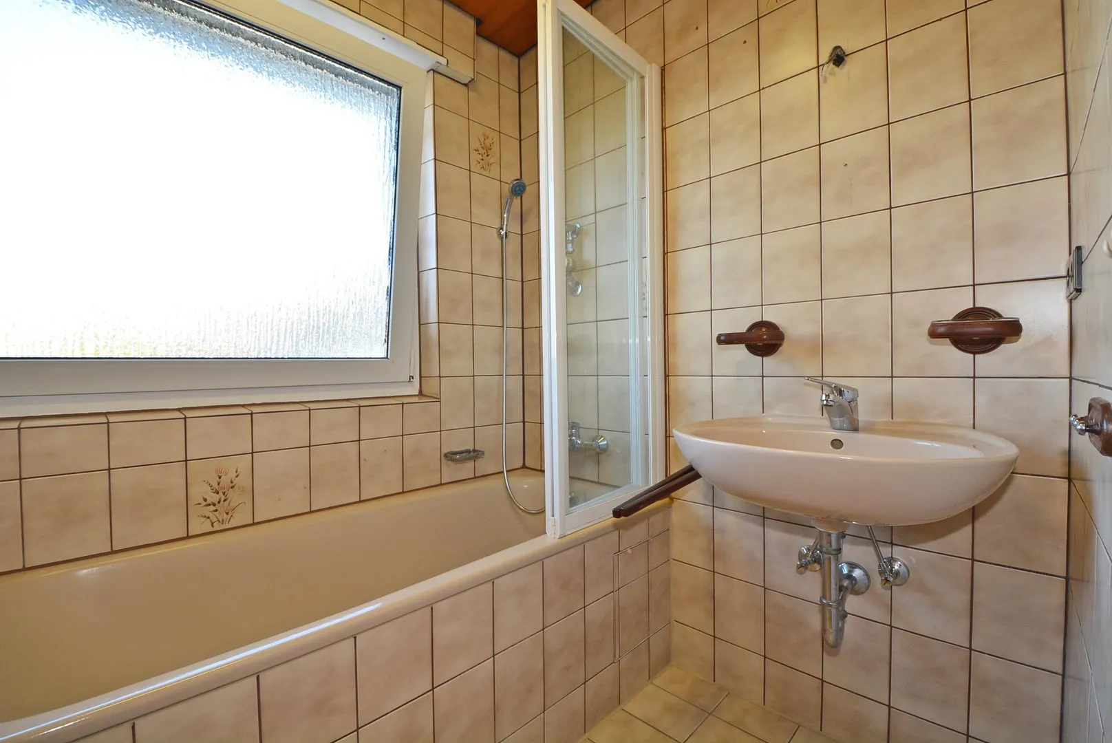 Das raumhoch geflieste Tageslicht-Badezimmer verfügt über eine Badewanne sowie über ein Waschbecken.