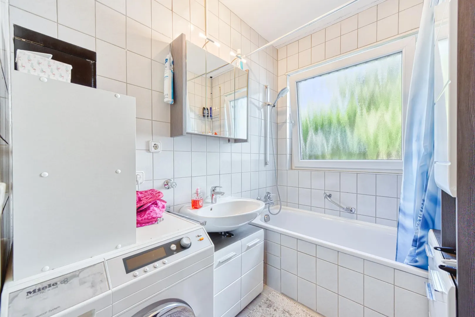 Das raumhoch geflieste Tageslicht-Badezimmer ist ausgestattet mit einer Badewanne sowie einem Waschmaschinenanschluß.